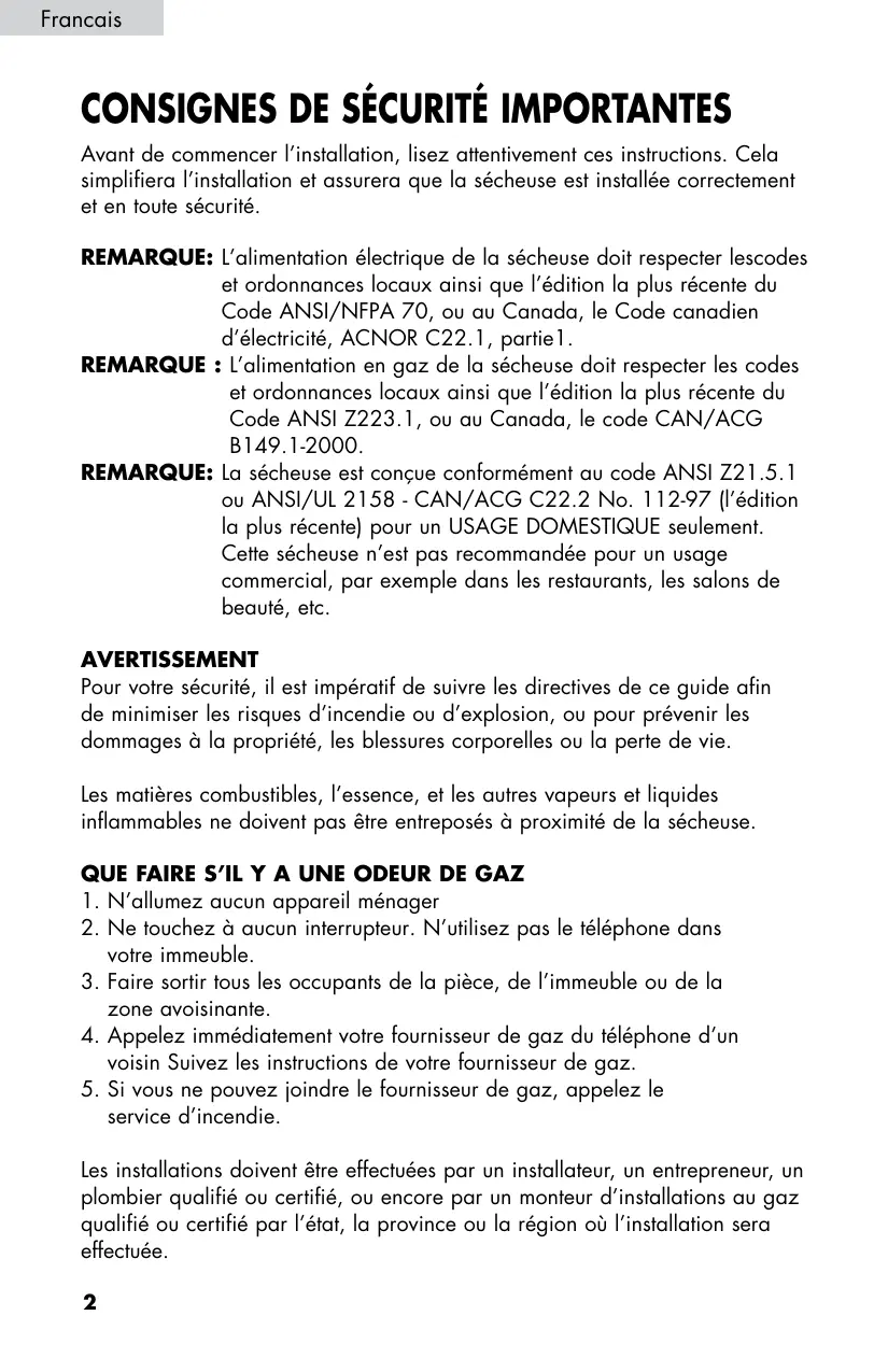 Avant de commencer l’installation, lisez attentivement ces instructions. Cela simplifiera l’installation et assurera que la sécheuse est installée correctement et en toute sécurité. REMARQUE: L ’alimentation électrique de la sécheuse doit respecter lescodes et ordonnances locaux ainsi que l’édition la plus récente du Code ANSI/NFPA 70, ou au Canada, le Code canadien d’électricité, ACNOR C22.1, partie1. REMARQUE : L’alimentation en gaz de la sécheuse doit respecter les codes et ordonnances locaux ainsi que l’édition la plus récente du Code ANSI Z223.1, ou au Canada, le code CAN/ACG B149.1-2000. REMARQUE: La sécheuse est conçue conformément au code ANSI Z21.5.1 ou ANSI/UL 2158 - CAN/ACG C22.2 No. 112-97 (l’édition la plus récente) pour un USAGE DOMESTIQUE seulement. Cette sécheuse n’est pas recommandée pour un usage commercial, par exemple dans les restaurants, les salons de beauté, etc. AVERTISSEMENT Pour votre sécurité, il est impératif de suivre les directives de ce guide afin de minimiser les risques d’incendie ou d’explosion, ou pour prévenir les dommages à la propriété, les blessures corporelles ou la perte de vie. Les matières combustibles, l’essence, et les autres vapeurs et liquides inflammables ne doivent pas être entreposés à proximité de la sécheuse. QUE FAIRE S’IL Y A UNE ODEUR DE GAZ