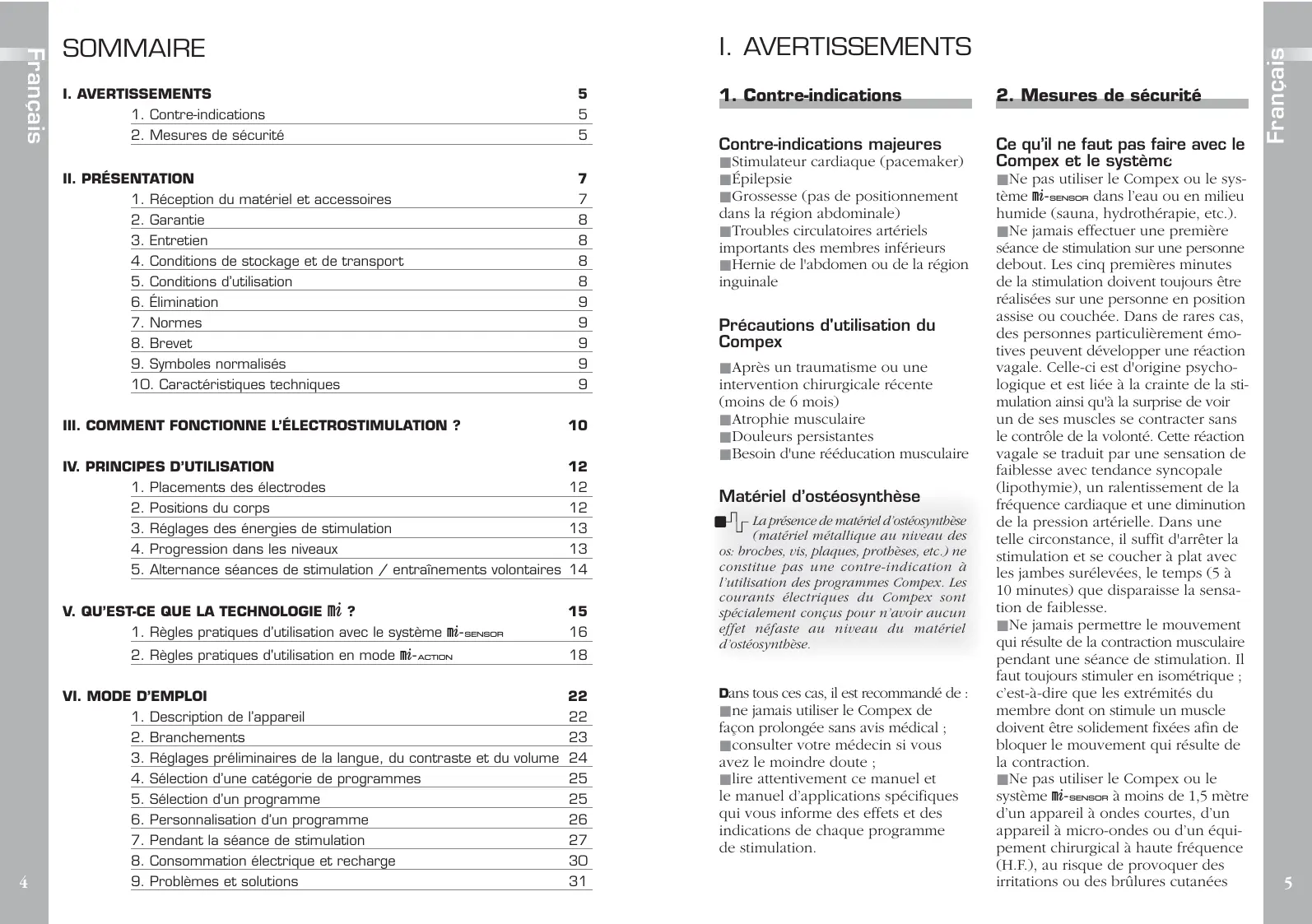 Contre-indications majeures Ce qu’il ne faut pas faire avec le Compex et le système4-m ■ Stimulateur cardiaque (pacemaker) ■ Épilepsie ■ Grossesse (pas de positionnement dans la région abdominale) ■ Troubles circulatoires artériels importants des membres inférieurs ■ Hernie de l'abdomen ou de la région inguinale Précautions d'utilisation du Compex ■ Après un traumatisme ou une intervention chirurgicale récente (moins de 6 mois) ■ Atrophie musculaire ■ Douleurs persistantes ■ Besoin d'une rééducation musculaire Matériel d’ostéosynthèse La présence de matériel d’ostéosynthèse (matériel métallique au niveau des os: broches, vis, plaques, prothèses, etc.) ne constitue pas une contre-indication à l’utilisation des programmes Compex. Les courants électriques du Compex sont spécialement conçus pour n’avoir aucun effet néfaste au niveau du matériel d’ostéosynthèse. Dans tous ces cas, il est recommandé de : ■ ne jamais utiliser le Compex de façon prolongée sans avis médical ; ■ consulter votre médecin si vous avez le moindre doute ; ■ lire attentivement ce manuel et le manuel d’applications spécifiques qui vous informe des effets et des indications de chaque programme de stimulation. ■ Ne pas utiliser le Compex ou le système m-4 dans l’eau ou en milieu humide (sauna, hydrothérapie, etc.). ■ Ne jamais effectuer une première séance de stimulation sur une personne debout. Les cinq premières minutes de la stimulation doivent toujours être réalisées sur une personne en position assise ou couchée. Dans de rares cas, des personnes particulièrement émotives peuvent développer une réaction vagale. Celle-ci est d'origine psychologique et est liée à la crainte de la stimulation ainsi qu'à la surprise de voir un de ses muscles se contracter sans le contrôle de la volonté. Cette réaction vagale se traduit par une sensation de faiblesse avec tendance syncopale (lipothymie), un ralentissement de la fréquence cardiaque et une diminution de la pression artérielle. Dans une telle circonstance, il suffit d'arrêter la stimulation et se coucher à plat avec les jambes surélevées, le temps (5 à 10 minutes) que disparaisse la sensation de faiblesse. ■ Ne jamais permettre le mouvement qui résulte de la contraction musculaire pendant une séance de stimulation. Il faut toujours stimuler en isométrique ; c’est-à-dire que les extrémités du membre dont on stimule un muscle doivent être solidement fixées afin de bloquer le mouvement qui résulte de la contraction. ■ Ne pas utiliser le Compex ou le système m-4 à moins de 1,5 mètre d’un appareil à ondes courtes, d’un appareil à micro-ondes ou d’un équipement chirurgical à haute fréquence (H.F.), au risque de provoquer des irritations ou des brûlures cutanées
