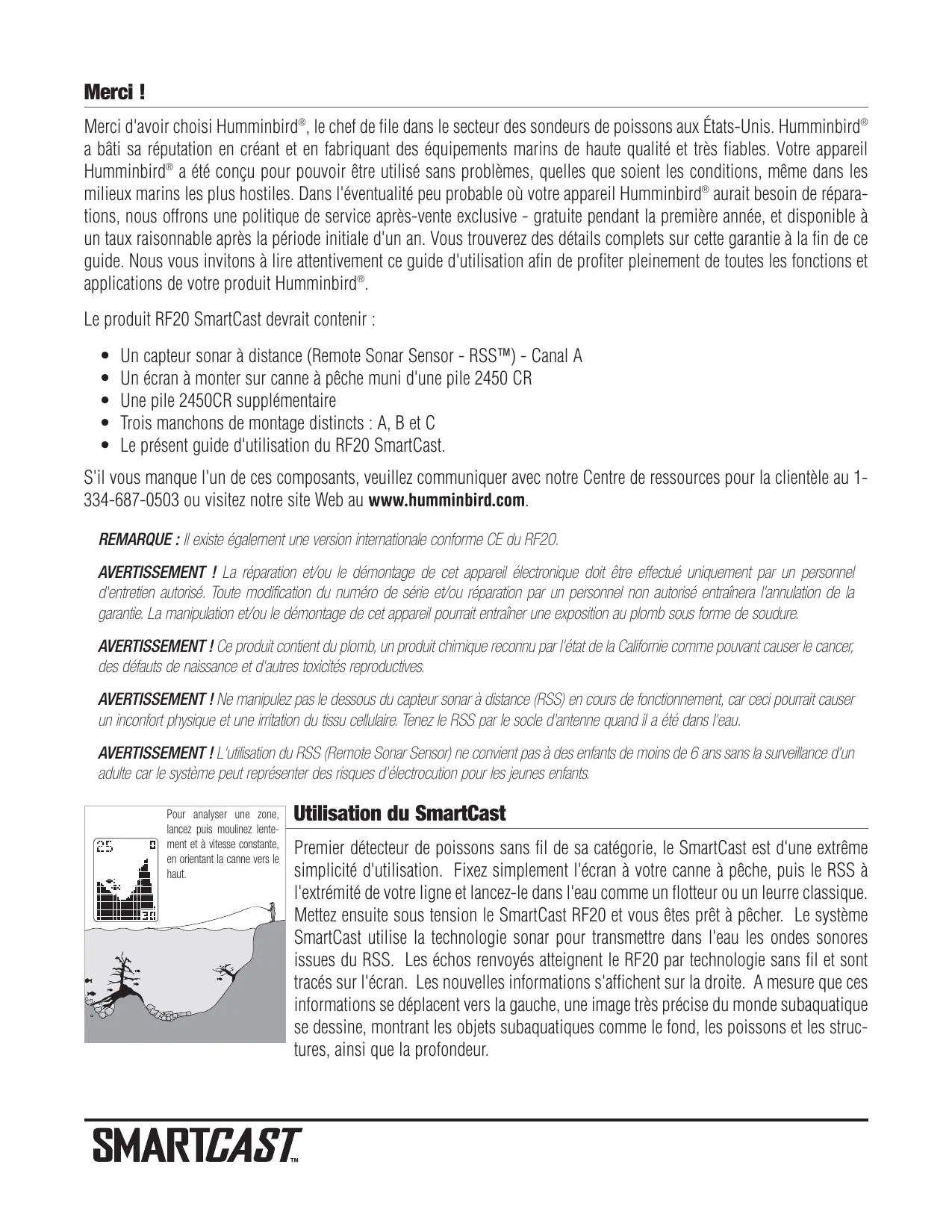 - Area of bottom coverage equals twice the current depth. Merci ! Merci d'avoir choisi Humminbird®, le chef de file dans le secteur des sondeurs de poissons aux États-Unis. Humminbird® a bâti sa réputation en créant et en fabriquant des équipements marins de haute qualité et très fiables. Votre appareil Humminbird® a été conçu pour pouvoir être utilisé sans problèmes, quelles que soient les conditions, même dans les milieux marins les plus hostiles. Dans l'éventualité peu probable où votre appareil Humminbird® aurait besoin de réparations, nous offrons une politique de service après-vente exclusive - gratuite pendant la première année, et disponible à un taux raisonnable après la période initiale d'un an. Vous trouverez des détails complets sur cette garantie à la fin de ce guide. Nous vous invitons à lire attentivement ce guide d'utilisation afin de profiter pleinement de toutes les fonctions et applications de votre produit Humminbird®. Le produit RF20 SmartCast devrait contenir :
