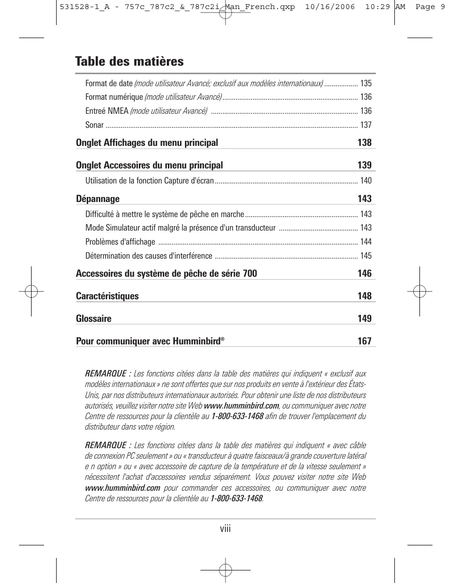 - Page 5 531528-1_A - 757c_787c2_&_787c2i_Man_French.qxp 10/16/2006 10:29 AM Table des matières Fenêtre sonar (exclusif au mode d'affichage Combiné) p. 79