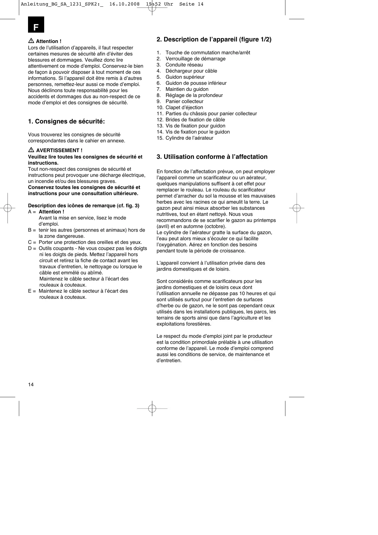 Fermer le câble de raccordement de lʼappareil à la fiche (figure 15/ rep. 1) et assurez le câble de raccordement avec la décharge de traction (figure 15/ rep. 2). Attention ! Afin dʼéviter une mise en service non intentionnée de lʼappareil, le guidon (figure 16/pos. 1) est doté dʼun interrupteur à deux positions (figure 16 / pos. 2), quʼil faut appuyer avant de pouvoir appuyer sur le levier de commande (figure 16 / pos. 3). Lʼappareil se met hors circuit dès quʼon lâche le levier de commande. Lorsque lʼon relâche le levier de commande, le scarificateur se met hors circuit. Effectuez ce processus plusieurs fois de suite pour être sûr que vote appareil fonctionne correctement. Avant dʼentreprendre des réparations ou des travaux de maintenance sur lʼappareil, il faut vous assurer que le rouleau à lame ne tourne pas et que lʼappareil est déconnecté. Attention ! Nʼouvrez jamais le clapet dʼéjection lorsque le moteur est encore en marche. Le rouleau à lame en rotation peut entraîner des blessures. Fixez toujours le clapet dʼéjection avec précaution. Il est refermé par les ressorts de traction en position „fermée“ ! La distance de sécurité donnée par les longerons de guidage entre le boîtier et lʼutilisateur (utilisatrice) doit toujours être maintenue. Il faut faire particulièrement attention pendant la scarification et les modifications de direction sur des talus et des pentes. Veillez à vous tenir de façon sûre, portez des chaussures à semelles anti-dérapantes et agrippantes et des pantalons longs. Faites la scarification toujours transversalement par rapport à la pente. Il ne faut pas se servir du scarificateur sur les pentes inclinées de plus de 15 degrés pour des raisons de sécurité. Faites particulièrement attention dans vos