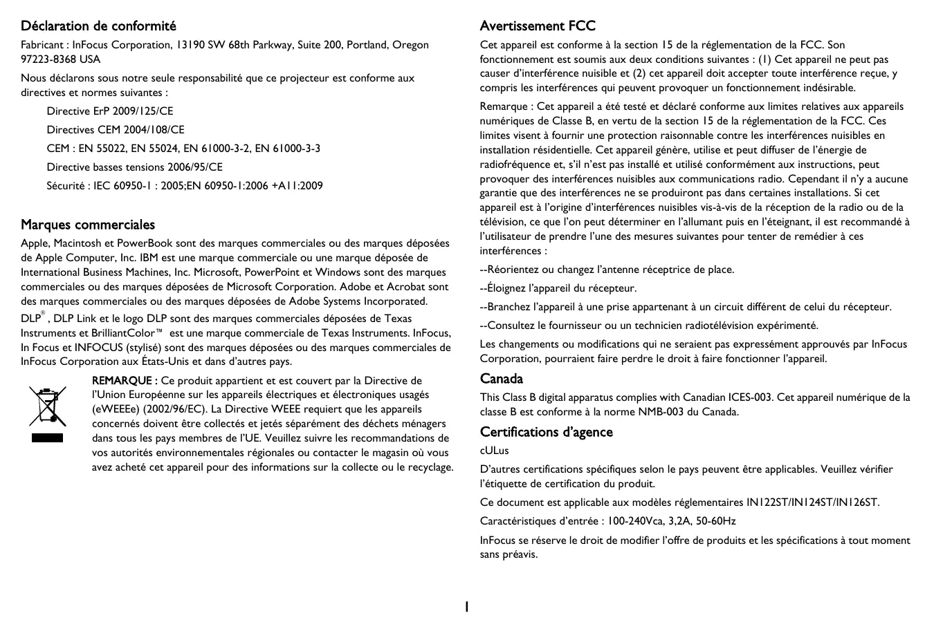Les changements ou modifications qui ne seront pas expressement approuvés par InFocus Corporation, pourraient faire perdre le droit à faire fonctionner l'appareil.