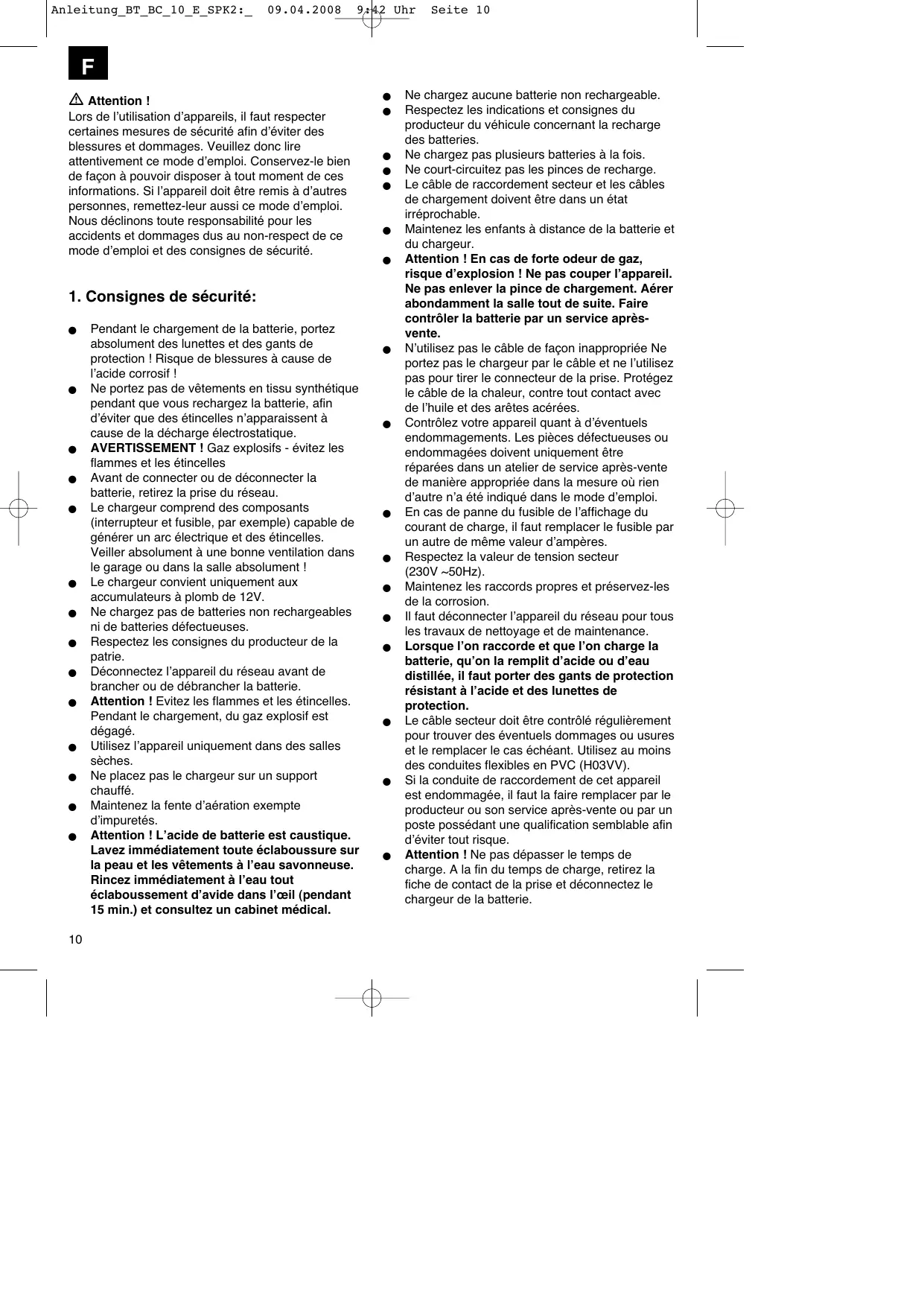 Pendant le chargement de la batterie, portez absolument des lunettes et des gants de protection ! Risque de blessures à cause de lʼacide corrosif ! Ne portez pas de vêtements en tissu synthétique pendant que vous rechargez la batterie, afin dʼéviter que des étincelles nʼapparaissent à cause de la décharge électrostatique. AVERTISSEMENT ! Gaz explosifs - évitez les flammes et les étincelles Avant de connecter ou de déconnecter la batterie, retirez la prise du réseau. Le chargeur comprend des composants (interrupteur et fusible, par exemple) capable de générer un arc électrique et des étincelles. Veiller absolument à une bonne ventilation dans le garage ou dans la salle absolument ! Le chargeur convient uniquement aux accumulateurs à plomb de 12V. Ne chargez pas de batteries non rechargeables ni de batteries défectueuses. Respectez les consignes du producteur de la patrie. Déconnectez lʼappareil du réseau avant de brancher ou de débrancher la batterie. Attention ! Evitez les flammes et les étincelles. Pendant le chargement, du gaz explosif est dégagé. Utilisez lʼappareil uniquement dans des salles sèches. Ne placez pas le chargeur sur un support chauffé. Maintenez la fente dʼaération exempte dʼimpuretés. Attention ! Lʼacide de batterie est caustique. Lavez immédiatement toute éclaboussure sur la peau et les vêtements à lʼeau savonneuse. Rincez immédiatement à lʼeau tout éclaboussement dʼavide dans lʼœil (pendant 15 min.) et consultez un cabinet médical.