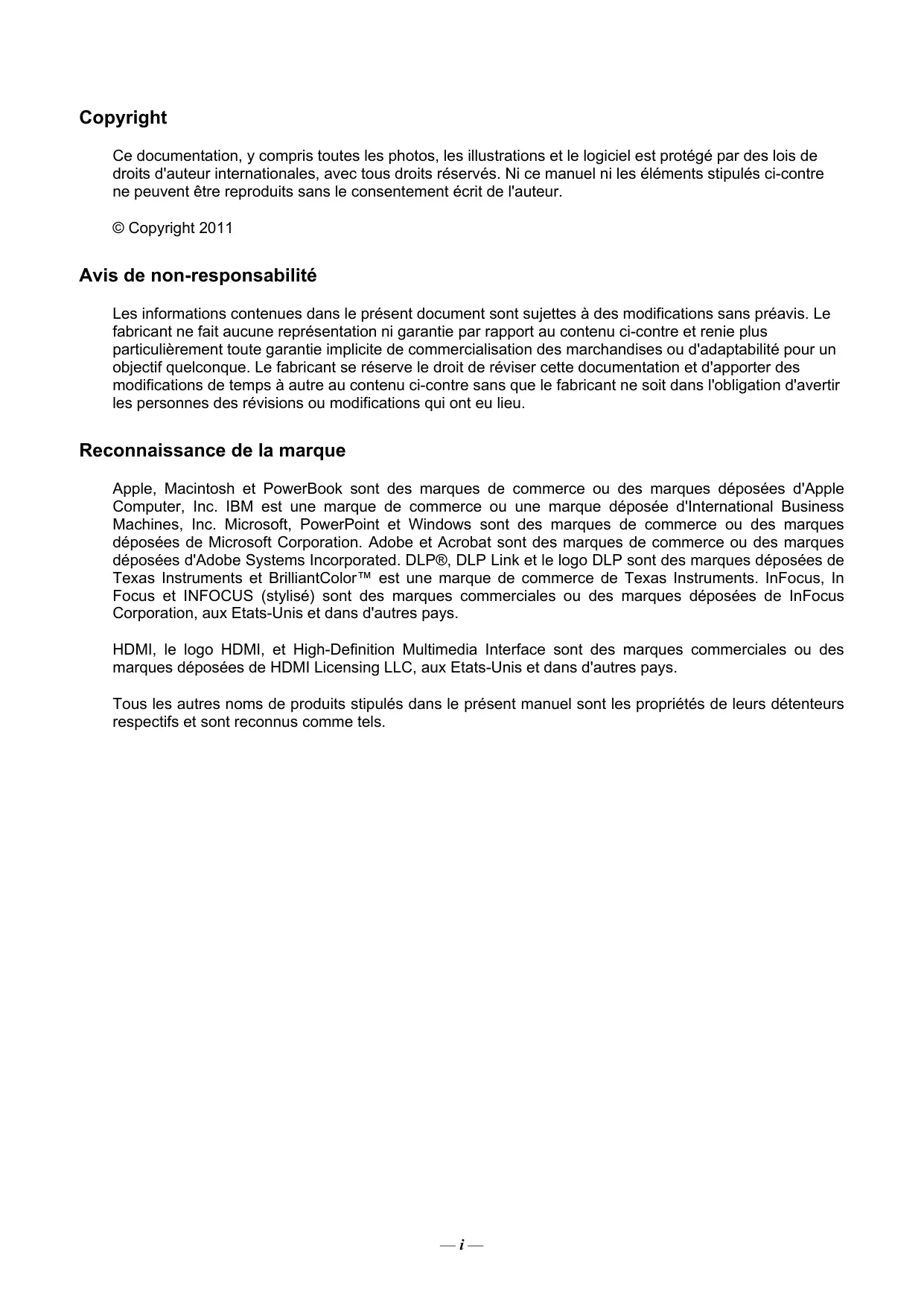 Apple, Macintosh et PowerBook sont des marques de commerce ou des marques déposées d'Apple Computer, Inc. IBM est une marque de commerce ou une marque déposée d'International Business Machines, Inc. Microsoft, PowerPoint et Windows sont des marques de commerce ou des marques déposées de Microsoft Corporation. Adobe et Acrobat sont des marques de commerce ou des marques déposées d'Adobe Systems Incorporated. DLP®, DLP Link et le logo DLP sont des marques déposées de Texas Instruments et BrilliantColor™ est une marque de commerce de Texas Instruments. InFocus, In Focus et INFOCUS (stylisé) sont des marques commerciales ou des marques déposées de InFocus Corporation, aux États-Unis et dans d'autres pays.