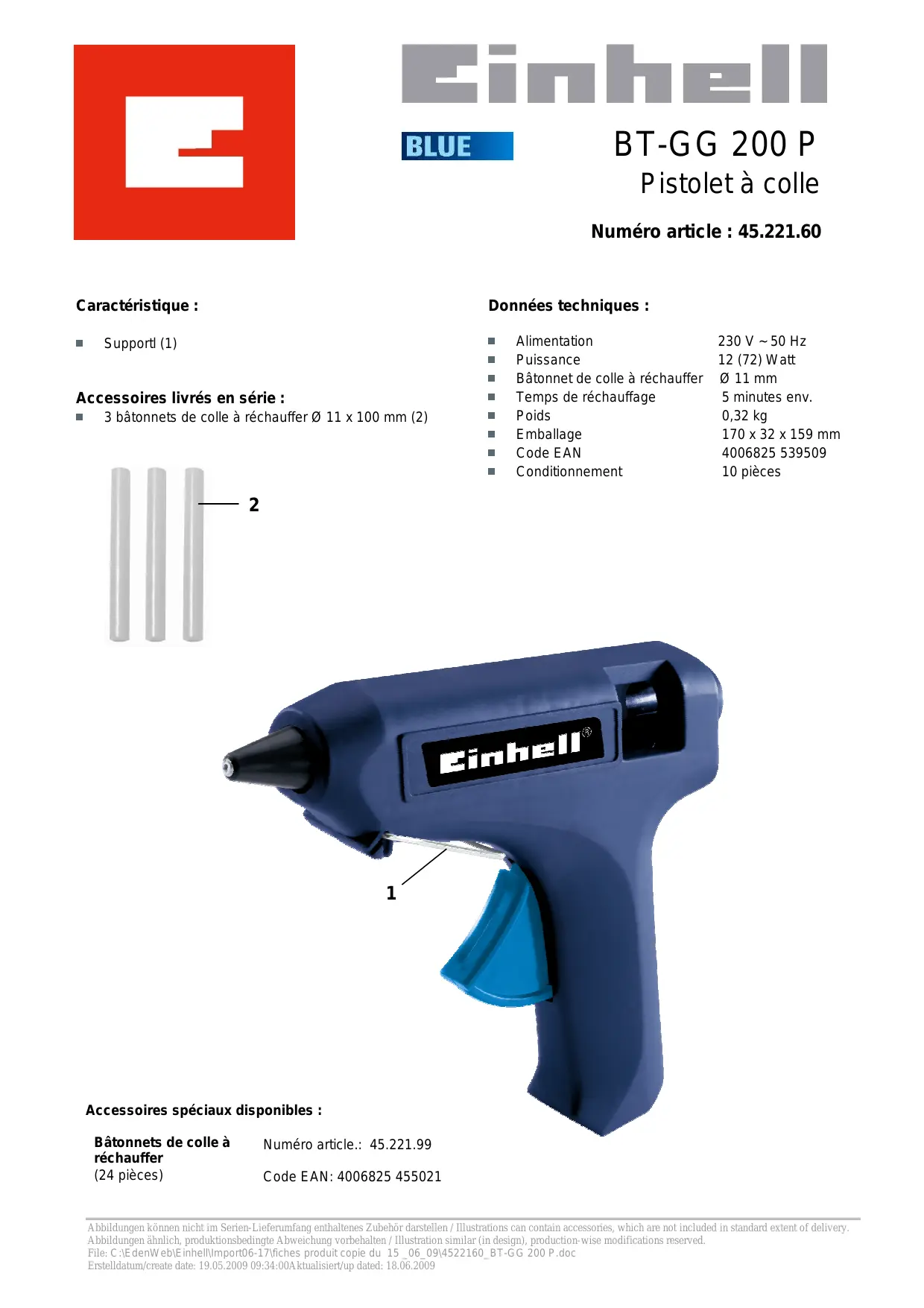 | Accessoires livrés | 3 bâtonnets de colle à réchauffer Ø 11 x 100 mm |