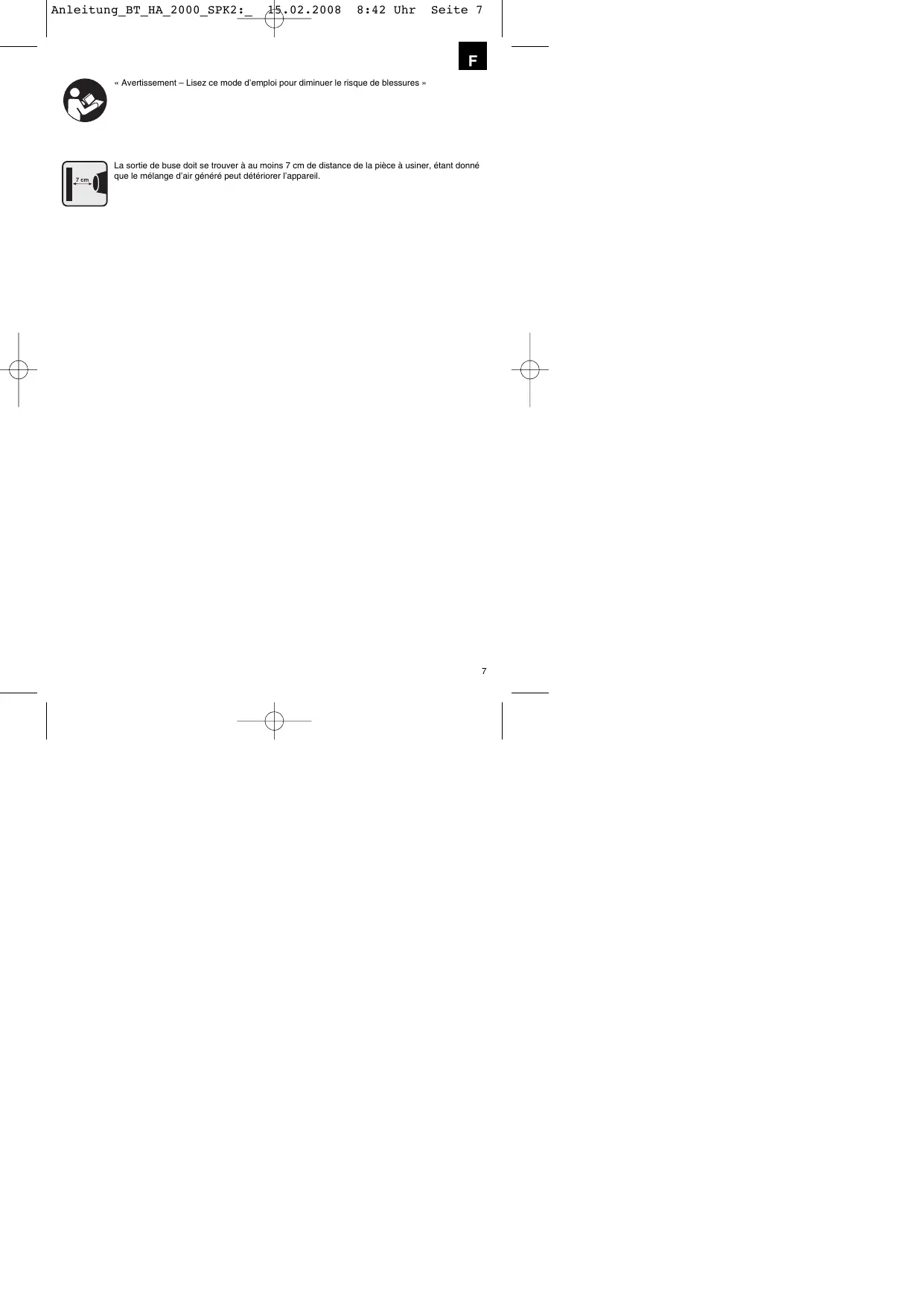 La sortie de buse doit se trouver à au moins 7 cm de distance de la pièce à usiner, étant donné que le mélange d’air généré peut détériorer l’appareil.