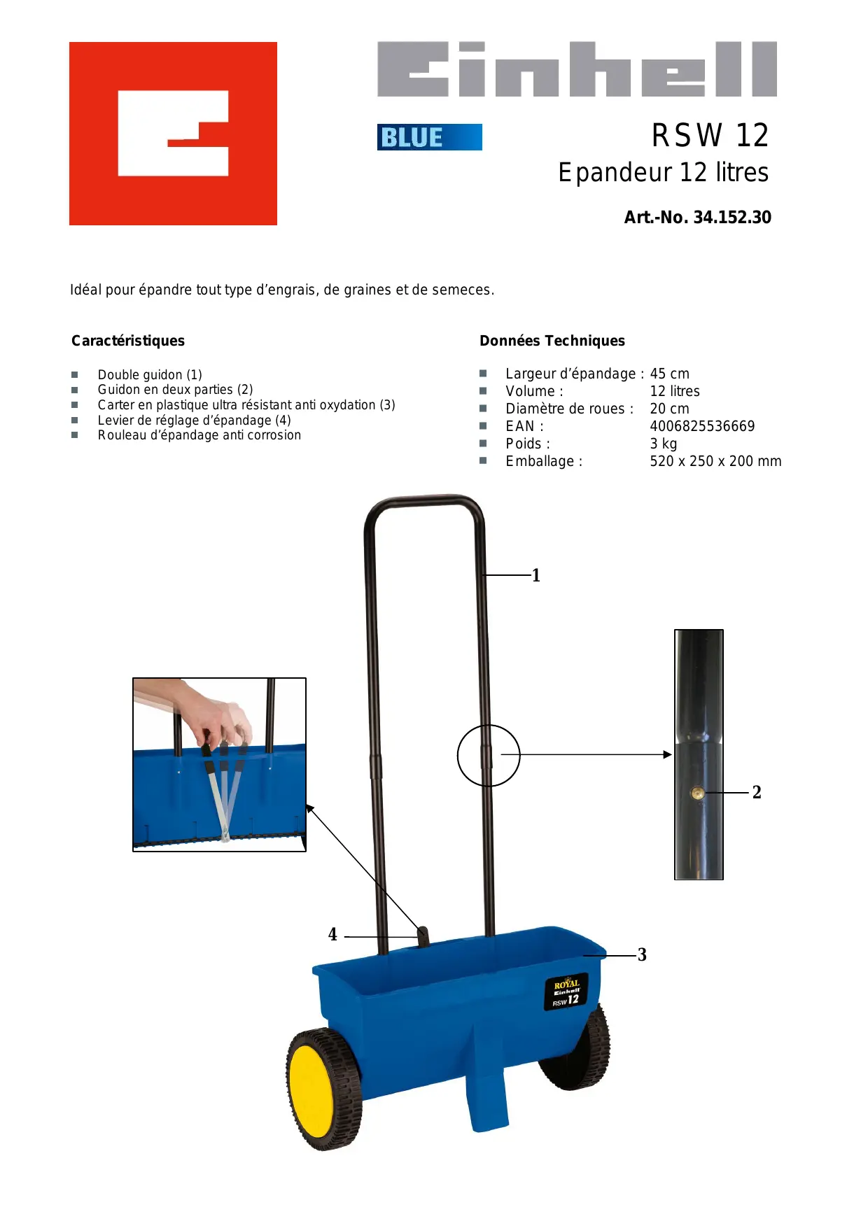 Double guidon (1) Guidon en deux parties (2) Carter en plastique ultra résistant anti oxydation (3) Levier de réglage d’épandage (4) Rouleau d’épandage anti corrosion