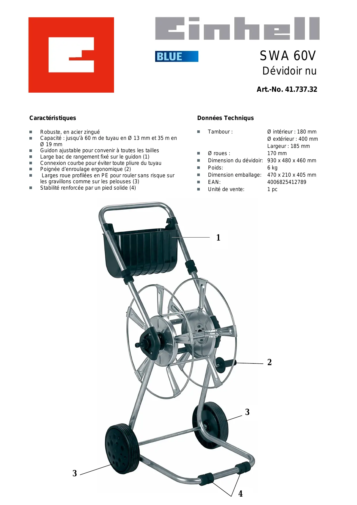 Large bac de rangement fixé sur le guidon (1) Connexion courbe pour éviter toute pliure du tuyau Poignée d’enroulage ergonomique (2) Larges roue profilées en PE pour rouler sans risque sur les gravillons comme sur les pelouses (3) Stabilité renforcée par un pied solide (4)