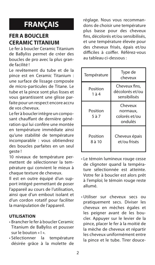 réglage. Nous vous recommandons de choisir une température plus basse pour des cheveux fins, décolorés et/ou sensibilisés, et une température élevée pour des cheveux frisés, épais et/ou difficiles à coiffer. Référez-vous au tableau ci-dessous : Le fer à boucler Ceramic Titanium de BaByliss permet de créer des boucles de pro avec la plus grande facilité ! Le revêtement du tube et de la pince est en Ceramic Titanium : une surface de lissage composée de micro-particules de Titane. Le tube et la pince sont plus lisses et vous garantissent une glisse parfaite pour un respect encore accru de vos cheveux. Le fer à boucler intègre un composant chauffant de dernière génération qui lui confère une montée en température immédiate ainsi qu’une stabilité de température incomparable : vous obtiendrez des boucles parfaites en un seul geste ! 10 niveaux de température permettent de sélectionner la température qui convient le mieux à chaque texture de cheveux. Il est en outre équipé d’un support intégré permettant de poser l’appareil au cours de l’utilisation, ainsi que d’un embout isolant et d’un cordon rotatif pour faciliter la manipulation de l’appareil. Température Type de cheveux Position 1à4 Cheveux fins, décolorés et/ou sensibilisés Position 5à7 Cheveux normaux, colorés et/ou ondulés Position 8 à 10 Cheveux épais et/ou frisés