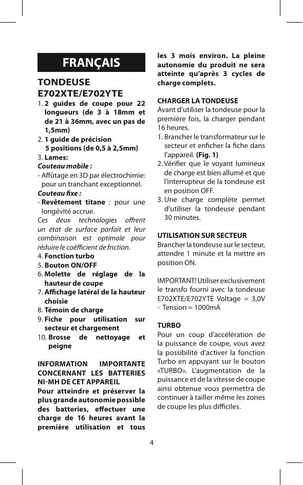 Brancher la tondeuse sur le secteur, attendre 1 minute et la mettre en position ON. IMPORTANT! Utiliser exclusivement le transfo fourni avec la tondeuse E702XTE/E702YTE Voltage = 3,0V - Tension = 1000mA TURBO Pour un coup d’accélération de la puissance de coupe, vous avez la possibilité d’activer la fonction Turbo en appuyant sur le bouton «TURBO». L’augmentation de la puissance et de la vitesse de coupe ainsi obtenue vous permettra de continuer à tailler même les zones de coupe les plus difficiles. Information importante concernant lES batterieS Ni-MH de cet appareil Pour atteindre et préserver la plus grande autonomie possible des batteries, effectuer une charge de 16 heures avant la première utilisation et tous