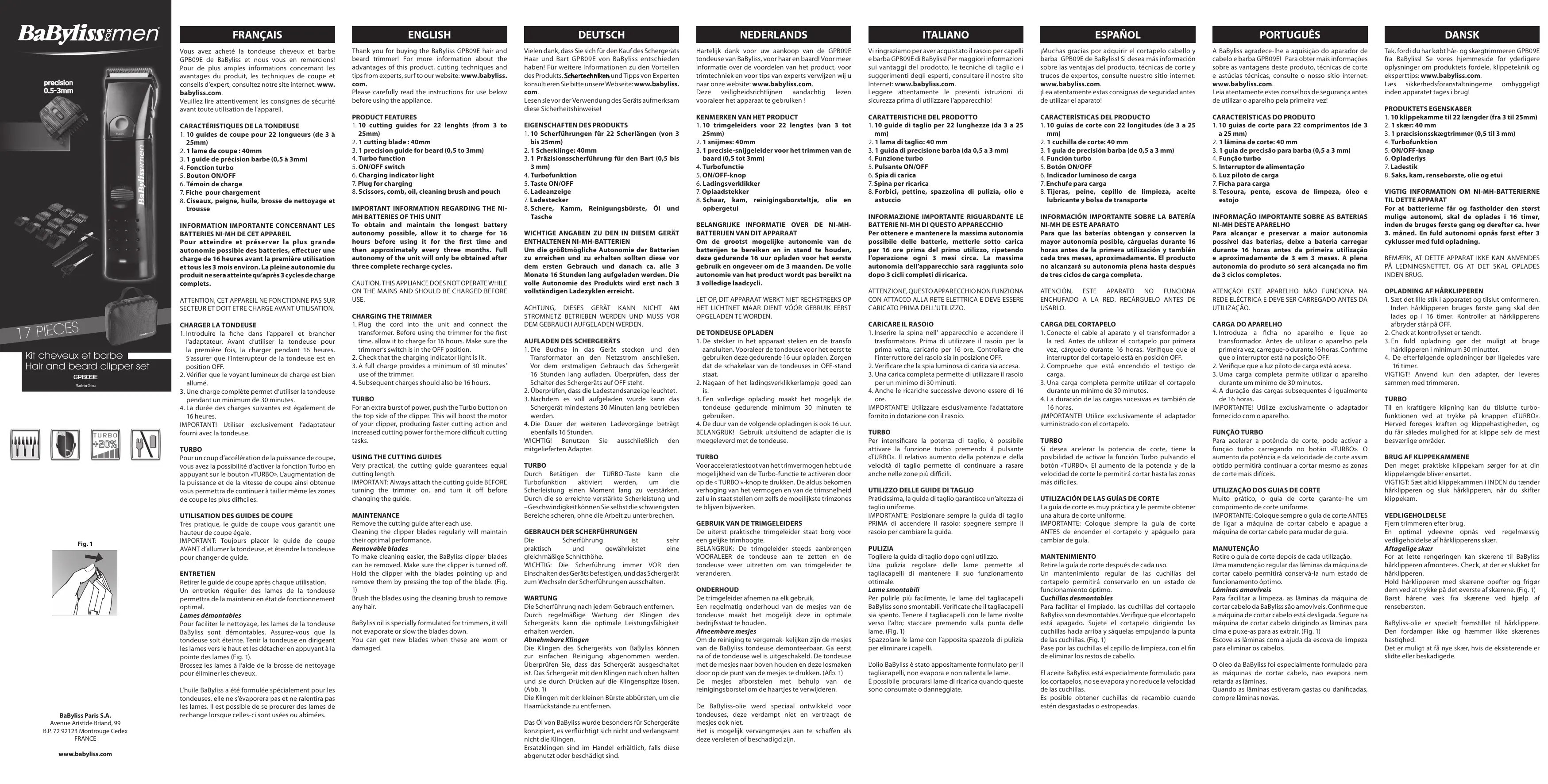 FRANÇAIS ENGLISH DEUTSCH NEDERLANDS ITALIANO ESPAÑOL PORTUGUÊS DANSK Vous avez acheté la tondeuse cheveux et barbe GPB09E de BaByliss et nous vous en remercions! Pour de plus amples informations concernant les avantages du produit, les techniques de coupe et conseils d’expert, consultez notre site internet: www. babyliss.com. Veuillez lire attentivement les consignes de sécurité avant toute utilisation de l’appareil.
