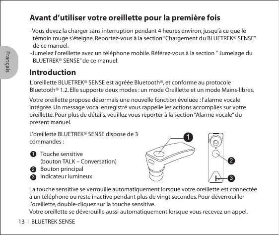 L'oreillette BLUETREK® SENSE est agrée Bluetooth®, et conforme au protocole Bluetooth® 1.2. Elle supporte deux modes: un mode Oreillette et un mode Maisons-libres.