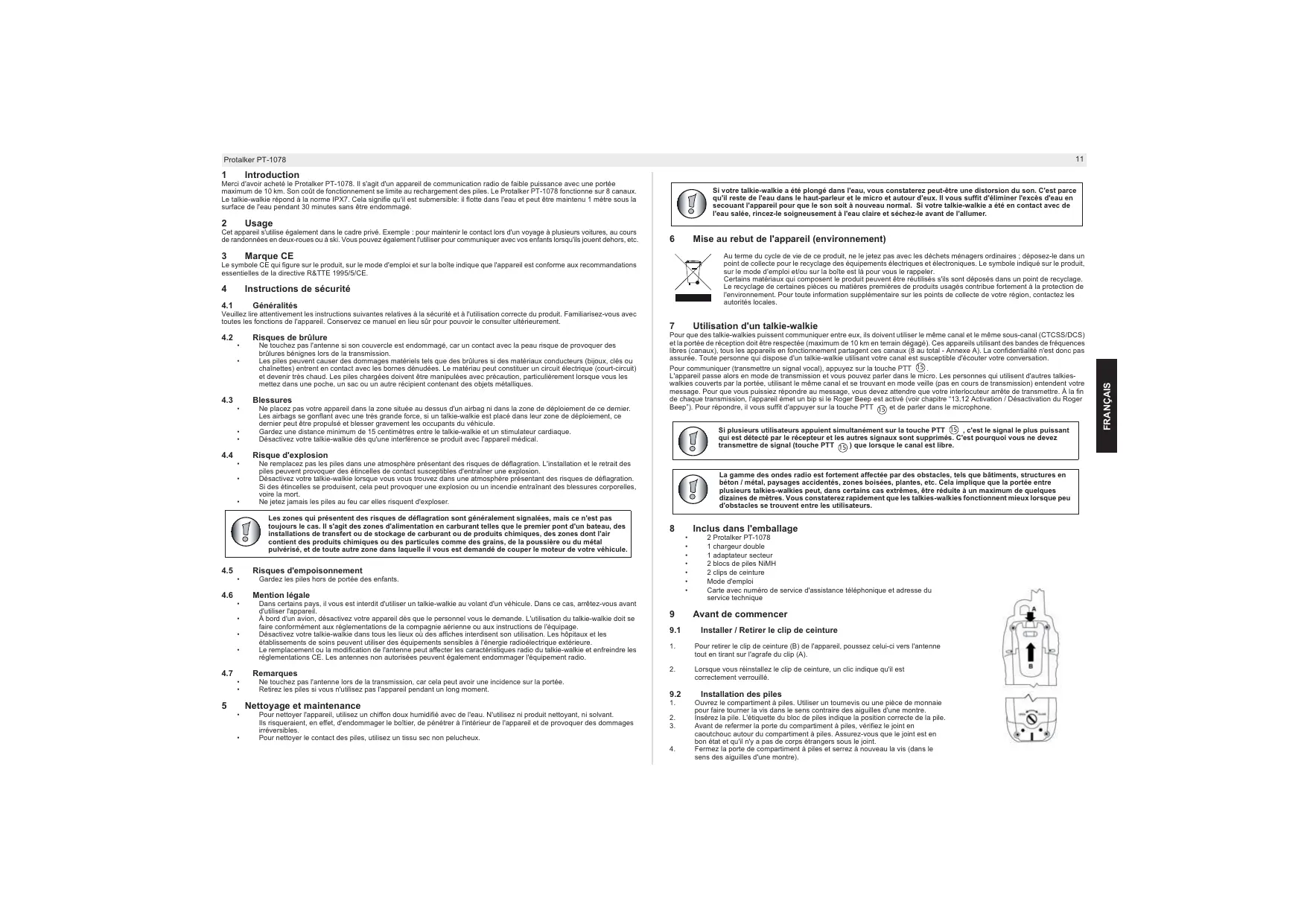 Merci d'avoir achete le Protalker PT-1078. Il s'agit d'un appeil re of communication radio de faible puissance avec une portee maximum de 10km . So kondt de fonctionnement se limite au rechargement des piles. Le Protalker PT-1078 fonctionne sur 8 canaux. The talkie-walkie respond a la norme IPX7. Cela signifie qu'il est submersible: il flotte dans l'eau et peutetre maintainu 1 metre sous la surface de I eau pendant 30 minutes sansetre endomage.