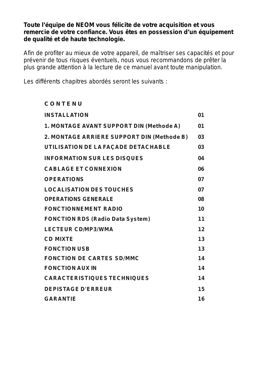 - Avant d'installer définitivement votre autoradio, vérifiez l'intégralité de vos connexions et effectuez un test préalable pour vous enquérir du bon fonctionnement de votre produit.