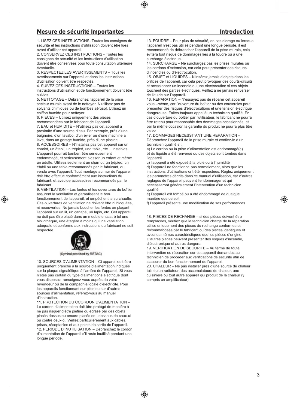- CONSERVEZ CES INSTRUCTIONS - Toutes les consignes de sécurité et les instructions d'utilisation doivent être conservées pour toute consultation ultérieure éventuelle.