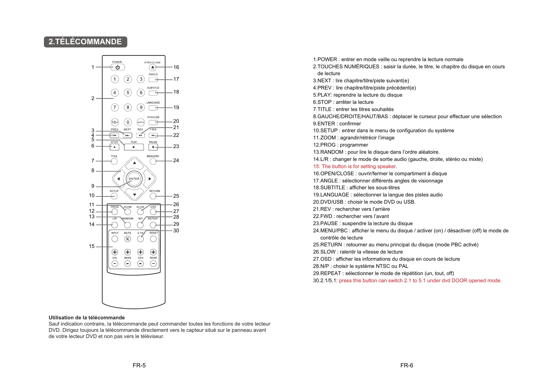 2.TOUCHES NUMÉRIQUES : saisir la durée, le titre, le chapitre du disque en cours de lecture 3.NEXT : lire chapitre/titre/piste suivant(e) 4.PREV : lire chapitre/titre/piste précédent(e) 5.PLAY: reprendre la lecture du disque 6.STOP : arrêter la lecture 7.TITLE : entrer les titres souhaités 8.GAUCHE/DROITE/HAUT/BAS : déplacer le curseur pour effectuer une sélection 9.ENTER : confirmer 10.SETUP : entrer dans le menu de configuration du système 11.ZOOM : agrandir/rétrécir l’image 12.PROG : programmer 13.RANDOM : pour lire le disque dans l’ordre aléatoire. 14.L/R : changer le mode de sortie audio (gauche, droite, stéréo ou mixte) 15: The button is for setting speaker. 16.OPEN/CLOSE : ouvrir/fermer le compartiment à disque 17.ANGLE : sélectionner différents angles de visionnage 18.SUBTITLE : afficher les sous-titres 19.LANGUAGE : sélectionner la langue des pistes audio 20.DVD/USB : choisir le mode DVD ou USB. 21.REV : rechercher vers l’arrière 22.FWD : rechercher vers l’avant 23.PAUSE : suspendre la lecture du disque 24.MENU/PBC : afficher le menu du disque / activer (on) / désactiver (off) le mode de contrôle de lecture 25.RETURN : retourner au menu principal du disque (mode PBC activé) 26.SLOW : ralentir la vitesse de lecture 27.OSD : afficher les informations du disque en cours de lecture 28.N/P : choisir le système NTSC ou PAL 29.REPEAT : sélectionner le mode de répétition (un, tout, off) 30.2.1/5.1: press this button can switch 2.1 to 5.1 under dvd DOOR opened mode.