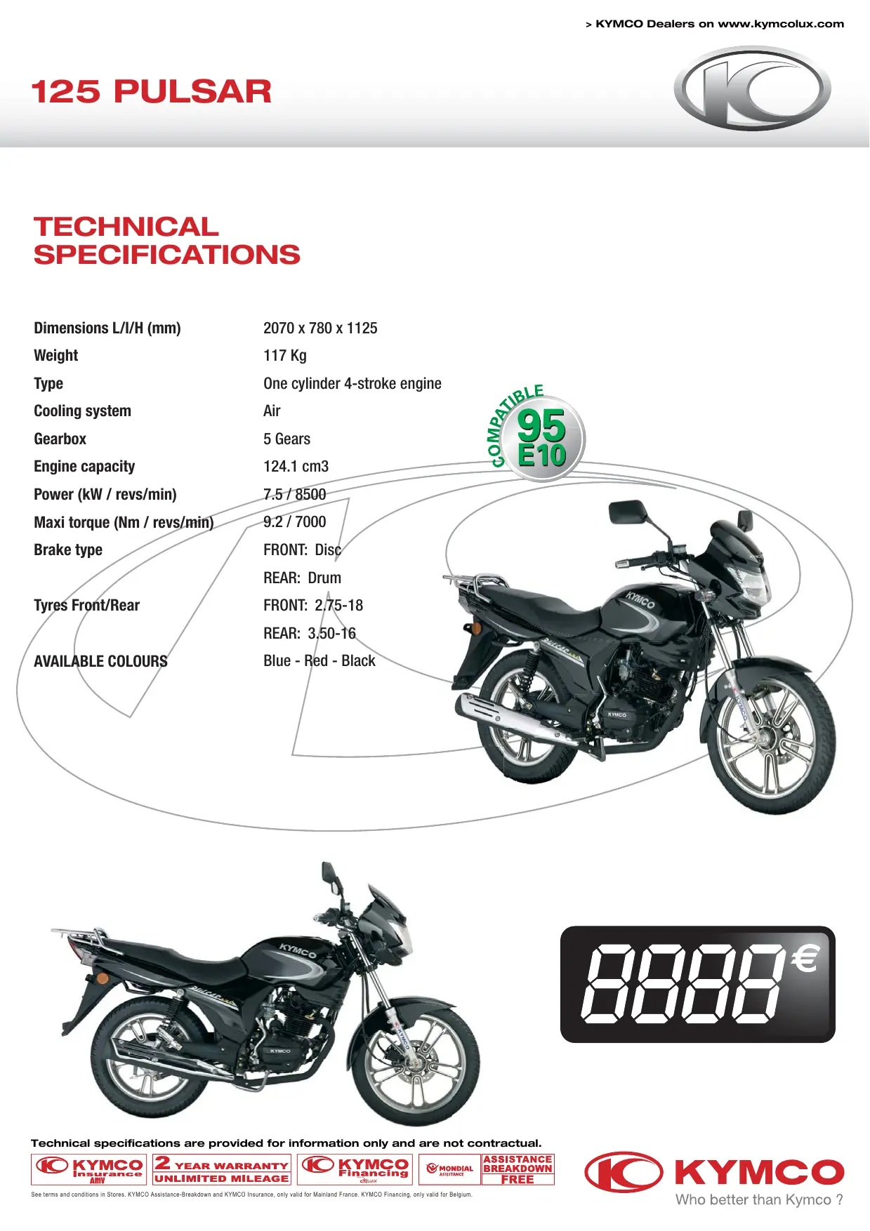 | Sécurité | Système de freinage combiné, éclairage de sécurité, antivol recommandé |