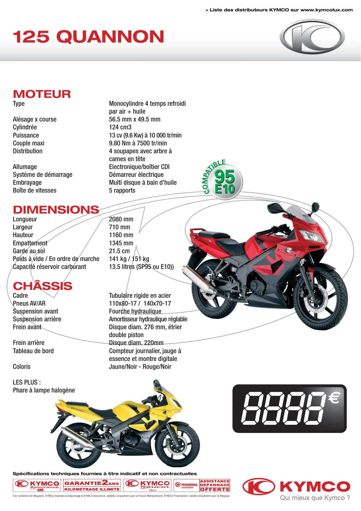 > Liste des distributeurs KYMCO sur www.kymcolux.com 125 QUANNON MOTEUR Type Monocylindre 4 temps refroidi par air + huile Alésage x course 56.5 mm x 49.5 mm Cylindrée 124 cm3 Puissance 13 cv (9.6 Kw) à 10 000 tr/min Couple maxi 9.80 Nm à 7500 tr/min Distribution 4 soupapes avec arbre à cames en tête LE Allumage Electronique/boîtier CDI Y Système de démarrage Démarreur électrique a 95 Embrayage Multi disque à bain d’huile = Boîte de vitesses 5 rapports A E10/ DIMENSIONS Longueur 2080 mm Largeur 710 mm Hauteur 1160 mm Empattement 1345 mm Gardé au sol 21.5 cm Poids à Wide / En ordre demarche 141 kg/151kg Capacité réservoir carburant 13.5 litres (SP95.ou E10)) CHASSIS Cadre Tubulaïre rigide en acier Pneus AV/AR 110x80-17 / 140x70-17 Suspension avant Fourche hydraulique Suspension arrière Amortisseur hydraulique réglable Frein avant Disque diam. 276 mm, étrier double piston Frein arrière Disque diam. 220mm Tableau de bord Compteur journalier, jauge à essence et montre digitale Coloris Jaune/Noir - Rouge/Noir LES PLUS : Phare à lampe halogène Spécifications techniques fournies à titre indicatif et non contractuelles OK 4OKYMCO Voir onditans en again. 1 GARANTIEZans KILOMETRAGE ILLIMITE Cmonpnr ÉOKYMCO ce-Dépamnage at KYUCO Assurance, vbs aniquement pour France Méopatäna. KYCO Financamet, sale uniquement pour Blue. Qui mieux que Kymco ?