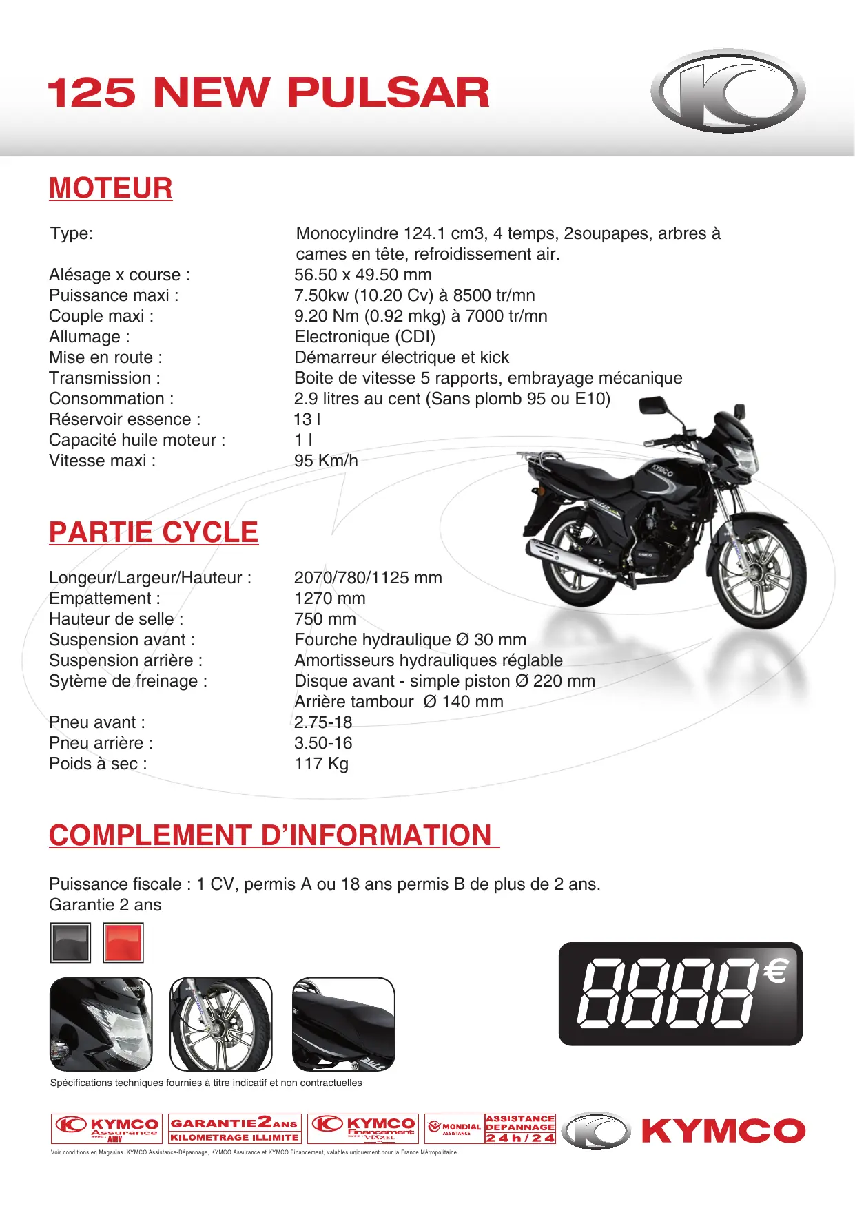 125 NEW PULSAR MOTEUR Type: Monocylindre 124.1 cm3, 4 temps, 2soupapes, arbres à cames en tête, refroidissement air. Alésage x course : 56.50 x 49.50 mm Puissance maxi : 7.50kw (10.20 Cv) à 8500 tr/mn Couple maxi : 9.20 Nm (0.92 mkg) à 7000 tr/mn Allumage : Electronique (CDI) Mise en route : Démarreur électrique et kick Transmission : Boite de vitesse 5 rapports, embrayage mécanique Consommation : 2.9 litres au cent (Sans plomb 95 ou E10) Réservoir essence : 13 l Capacité huile moteur : 1 l Vitesse maxi : 95 Km/h PARTIE CYCLE Longeur/Largeur/Hauteur : 2070/780/1125 mm Empattement : 1270 mm Hauteur de selle : 750 mm Suspension avant : Fourche hydraulique Ø 30 mm Suspension arrière : Amortisseurs hydrauliques réglable Sytème de freinage : Disque avant - simple piston Ø 220 mm Arrière tambour Ø 140 mm Pneu avant : 2.75-18 Pneu arrière : 3.50-16 Poids à sec : 117 Kg