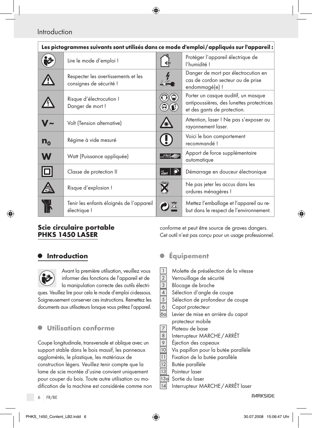 protecteur mobile Plateau de base Interrupteur MARCHE / ARRÊT Éjection des copeaux Vis papillon pour la butée parallèle Fixation de la butée parallèle Butée parallèle Pointeur laser Sortie du laser Interrupteur MARCHE / ARRÊT laser FR/BE PHKS_1450_Content_LB2.indd 6