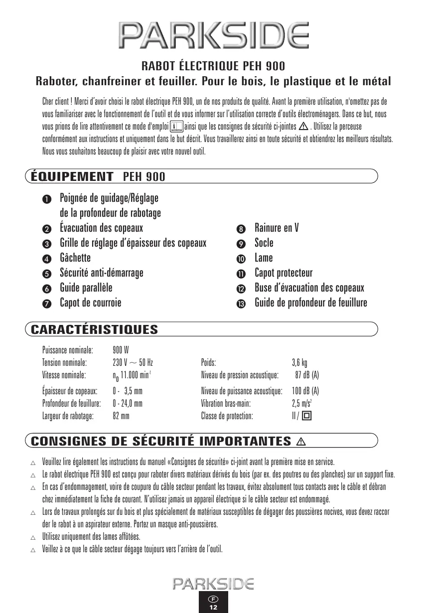 PEH 900 - Raboteuse électrique PARKSIDE - Notice d'utilisation et mode d'emploi gratuit