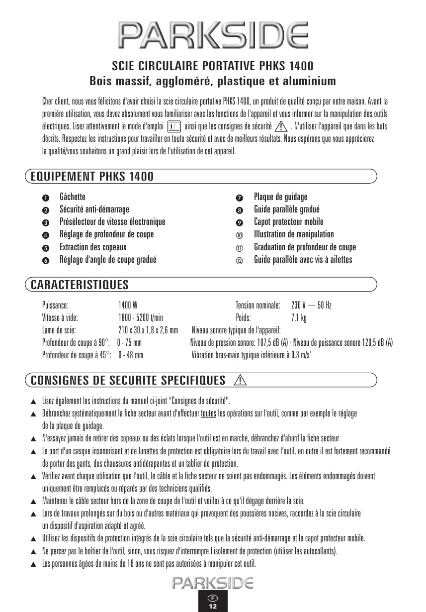 SCIE CIRCULAIRE PORTATIVE PHKS 1400 Bois massif, aggloméré, plastique et aluminium Cher client, nous vous félicitons d'avoir choisi la scie circulaire portative PHKS 1400, un produit de qualité conçu par notre maison. Avant la première utilisation, vous devez absolument vous familiariser avec les fonctions de l'appareil et vous informer sur la manipulation des outils électriques. Lisez attentivement le mode d'emploi ainsi que les consignes de sécurité ! . N'utilisez l'appareil que dans les buts décrits. Respectez les instructions pour travailler en toute sécurité et avec de meilleurs résultats. Nous espérons que vous apprécierez la qualité/vous souhaitons un grand plaisir lors de l'utilisation de cet appareil.