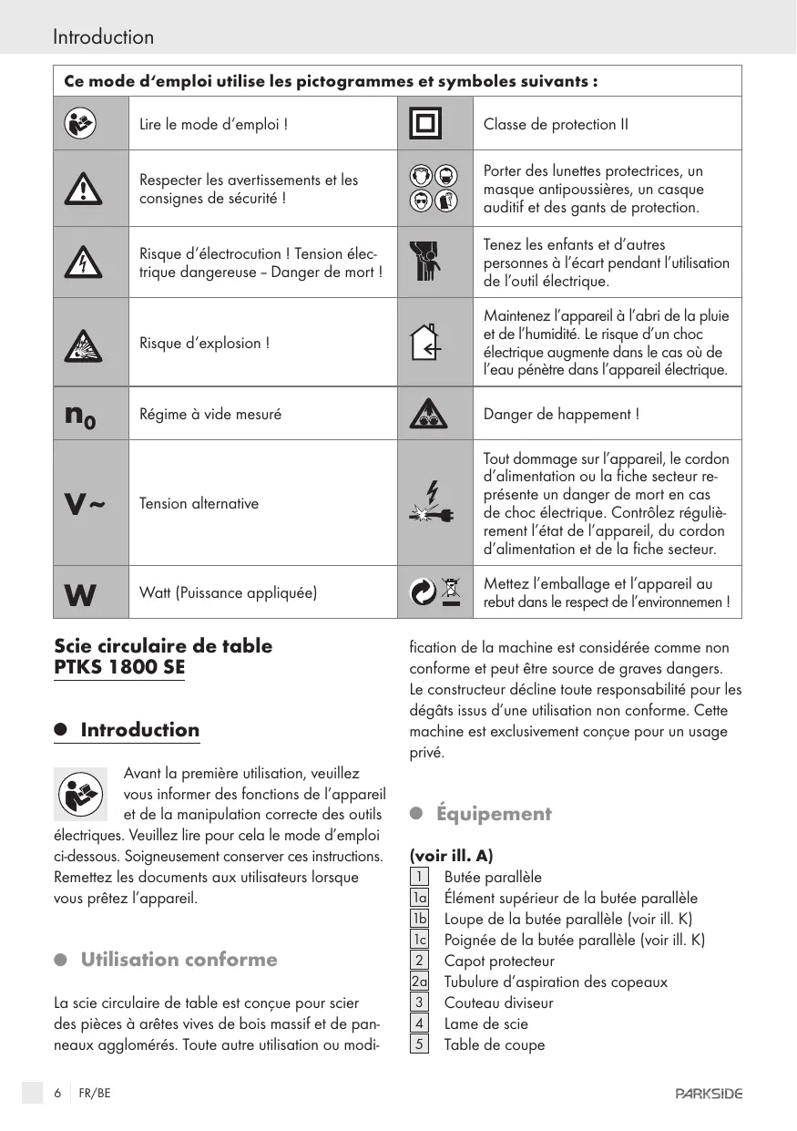 Mettez l'emballage et l'appareil au rebut dans le respect de l'environnemen ! (OL Scie circulaire de table PTKS 1800 SE © Introduction Avant la première utilisation, veuillez vous informer des fonctions de l'appareil et de la manipulation correcte des outils électriques. Veuillez lire pour cela le mode d'emploi ci-dessous. Soigneusement conserver ces instructions. Remettez les documents aux utilisateurs lorsque vous prêtez l'appareil. La scie circulaire de table est conçue pour scier des pièces à arêtes vives de bois massif et de pan- neaux agglomérés. Toute autre utilisation ou modi- 6 FR/BE fication de la machine est considérée comme non conforme et peut être source de graves dangers. Le constructeur décline toute responsabilité pour les dégâts issus d'une utilisation non conforme. Cette machine est exclusivement conçue pour un usage privé. © Équipement IL. A) Butée parallèle Élément supérieur de la butée parallèle Loupe de la butée parallèle (voir ill. K] Poignée de la butée parallèle [voir il. K] Capot protecteur Tubulure d'aspiration des copeaux Couteau diviseur Lame de scie Table de coupe PARKSIDE