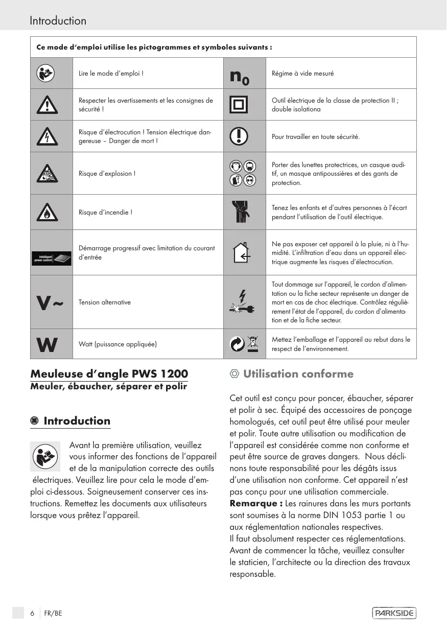 Introduction Ce mode d'emploi utilise les pictogrammes et symboles suivants : Lire le mode d'emploi ! Régime à vide mesuré Respecter les avertissements et les consignes de sécurité | Oui électrique de la classe de protection I; double isolationa Risque d'élecirocufion ! Tension électrique dan gereuse - Danger de mort ! Pour travailler en toute sécurité. Risque d'explosion ! Porter des lunettes protecrices, un casque audi Ge) area nipoussières et des gants de Risque d'incendie ! Tenez les enfants et d'autres personnes à l'écart pendant l'uffsation de l'outil électrique. Démarrage progressif avec limitation du courant d'entrée Ne pas exposer cet appareil à le pluie, ni à l'hu midi. L'iflration d'eau dans un appareil élec. rique augmente les risques d'électrocution. Tension alternative Tout dommage sur l'appareil le cordon d'alimen- 4 Haïion ou la fiche secteur représente un danger de mort en cas de choc électrique. Conrôlez réguliè- remen l'état de l'appareil, du cordon d'aliment fion et de la fiche secteur. Watt (puissance appliquée) s<Ao>bbe Mettez l'emballage et l'appareil au rebut dans le respect de l'environnement. Meuleuse d'angle PWS 1200 Meuler, ébaucher, séparer et polir ® Introduction Avant la première utilisation, veuillez vous informer des fonctions de l'appareil et de la manipulation correcte des outils électriques. Veuillez lire pour cela le mode d'em- ploi tructions. Remettez les documents aux utilisateurs dessous. Soigneusement conserver ces ins- lorsque vous prêtez l'appareil 6 FR/BE © Utilisation conforme Cet outil est conçu pour poncer, ébaucher, séparer et polir à sec. Équipé des accessoires de ponçage homologués, cet outil peut être utilisé pour meuler et polir. Toute autre utilisation ou modification de l'appareil est considérée comme non conforme et peut être source de graves dangers. Nous décli- nons toute responsabilité pour les dégâts issus d'une utilisation non conforme. Cet appareil n'est pas conçu pour une utilisation commerciale. Remarque : Les rainures dans les murs portants sont soumises à la norme DIN 1053 partie 1 ou aux réglementation nationales respectives. Il faut absolument respecter ces réglementations. Avant de commencer la tâche, veuillez consulter le staticien, l'architecte ou la direction des travaux responsable. PARKSIDE