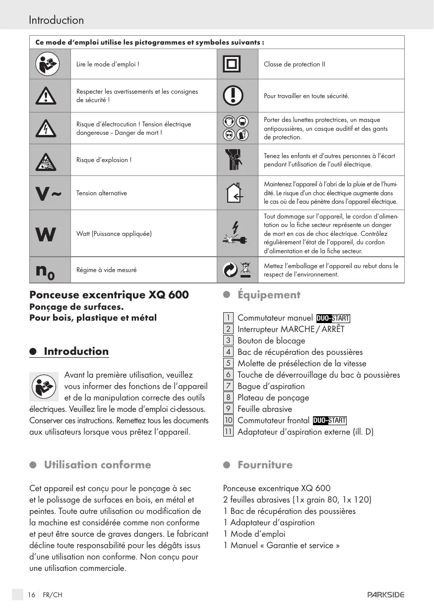 Fourniture Ponceuse excentrique XQ 600 2 feuilles abrasives (1x grain 80, 1x 120) 1 Bac de récupération des poussières 1 Adaptateur d‘aspiration 1 Mode d‘emploi 1 Manuel « Garantie et service » Introduction / Consignes de sécurité générales
