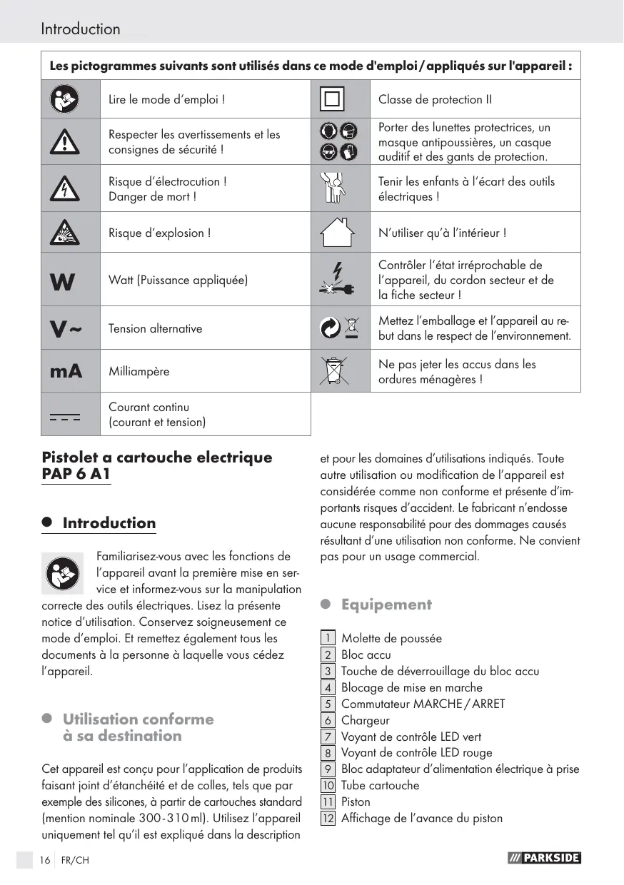 chargeur accu (230 V~, 50 Hz). Risque d’endommagement du chargeur accu dans le cas contraire. Avant l’utilisation, contrôlez l’appareil afin de détecter d’éventuels endommagements et bris, et contrôlez sans cartouche le parfait fonctionnement du piston 11 . Vous garantirez ainsi le parfait fonctionnement de l’appareil. Tenez compte de la date limite d’utilisation des cartouches utilisées. Des cartouches anciennes ou sèches peuvent entraîner une sollicitation excessive et un endommagement de l’appareil. Tenez compte des indications du fabricant de la cartouche concernant l’utilisation et la température de traitement. Respectez scrupuleusement ces données. Ceci permet d’éviter un endommagement de l’appareil. Commencez le travail à faible vitesse. Ceci permet d’empêcher une sollicitation excessive du moteur et un giclement du produit d’étanchéité / de la colle. Eteignez immédiatement l’appareil en cas de comportement inhabituel ou de bruits inhabituels. Risque d’endommagement de l’appareil dans le cas contraire. Les enfants ou les personnes ne possédant pas les connaissances ou l’expérience requise avec cet appareil, ou dont les aptitudes physiques, sensorielles ou mentales sont limitées, ne doivent pas utiliser l’appareil sans la surveillance ou la direction d’une personne responsable pour leur sécurité. Il convient de surveiller les enfants de manière à ce qu’ils ne jouent pas avec l’appareil.