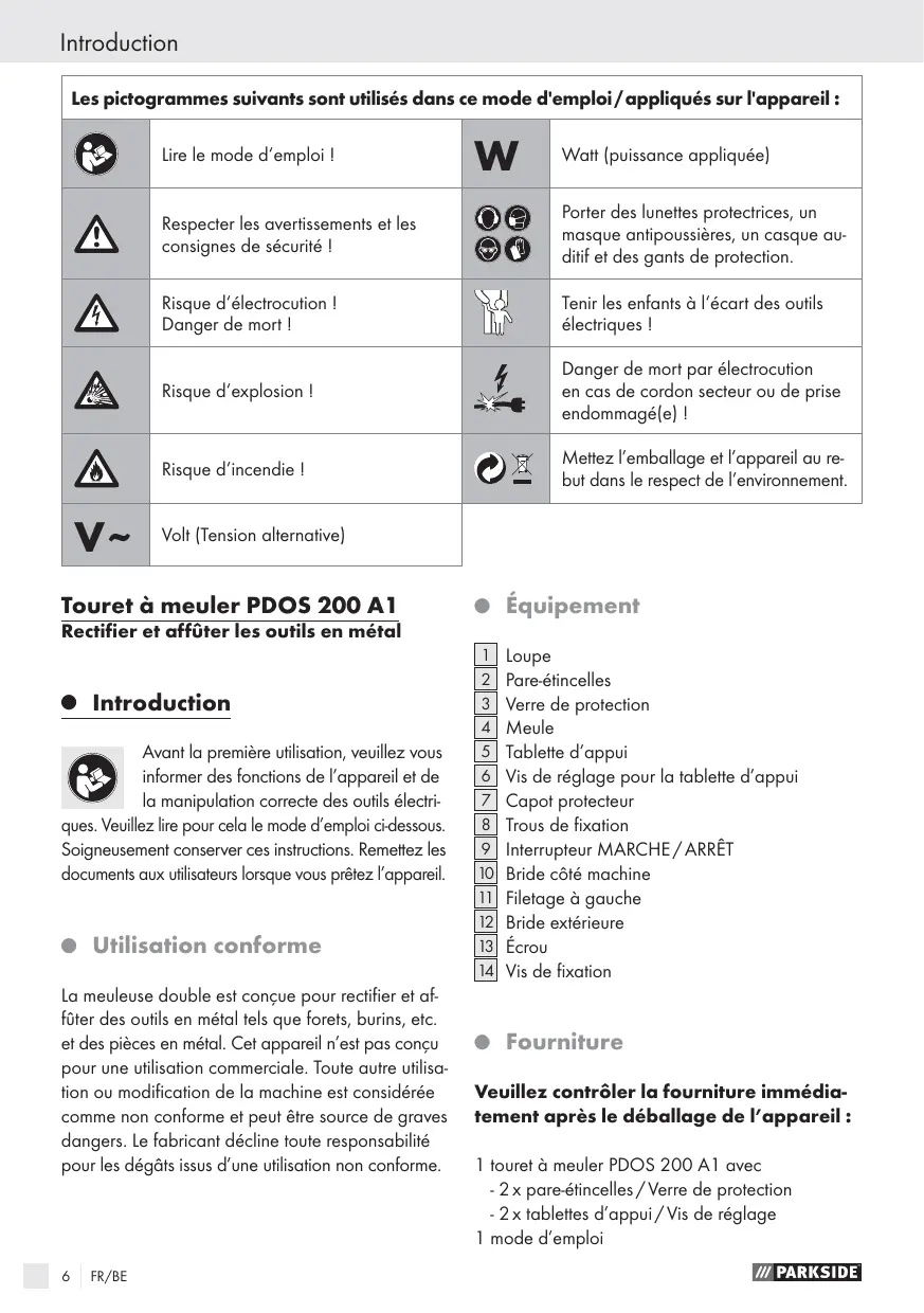 La meuleuse double est conçue pour rectifier et af- fôter des outils en métal tels que forets, burins, etc. et des pièces en métal. Cet appareil n'est pas conçu pour une utilisation commerciale. Toute autre utilisa- tion ou modification de la machine est considérée comme non conforme et peut être source de graves dangers. Le fabricant décline toute responsabi pour les dégâts issus d’une utilisation non conforme.