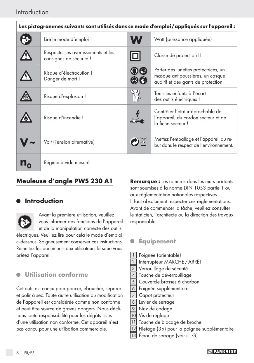 Uniquement utiliser des meules de tronçonnage renforcées fibre certifiées et homologuées pour une vitesse de rotation d’au moins 80 m / s. ATTENTION ! La meule continue de tourner après l’extinction. Ne jamais freiner la meule par une contre-pression latérale. Fixer la pièce usinée. Utiliser des dispositifs de serrage / étau pour fixer la pièce usinée. La pièce est ainsi plus sûrement fixée qu’à la main. FR/BE Toujours arrêter l’appareil et attendre l’arrêt complet de la meule avant de poser l’outil. En cas de panne de courant ou de débranchement de la fiche secteur, immédiatement débloquer l’interrupteur MARCHE / ARRÊT. Le positionner sur ARRÊT. Ceci évite toute remise en marche intempestive. Uniquement utiliser cet appareil pour la découpe ou le ponçage à sec. La poignée supplémentaire 6 doit être montée pour tous les travaux avec l’appareil. Ne pas usiner des matériaux à base d’amiante. L’amiante est considérée cancérigène.