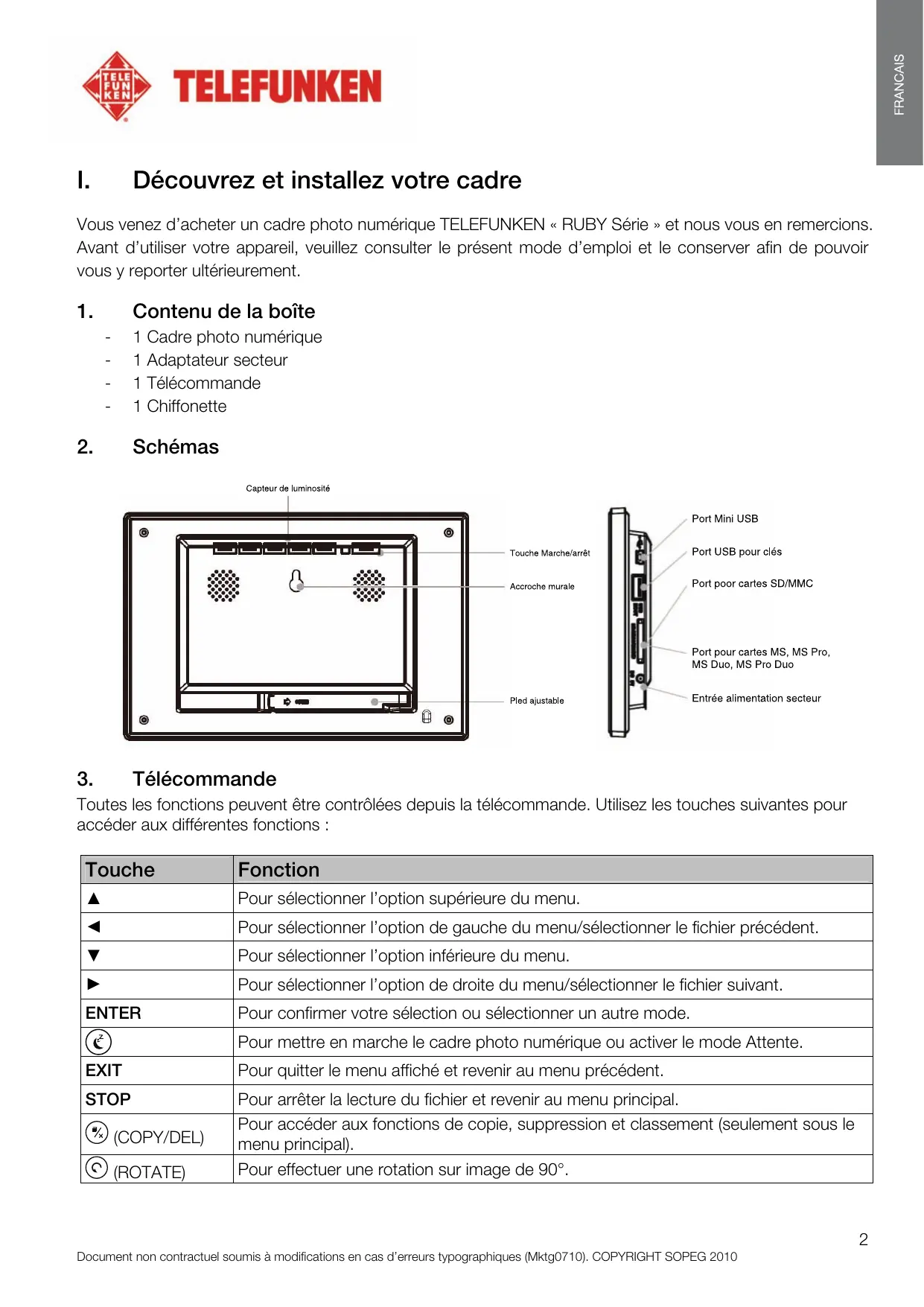 Découvrez et installez votre cadre Vous venez d’acheter un cadre photo numérique TELEFUNKEN « RUBY Série » et nous vous en remercions. Avant d’utiliser votre appareil, veuillez consulter le présent mode d’emploi et le conserver afin de pouvoir vous y reporter ultérieurement.