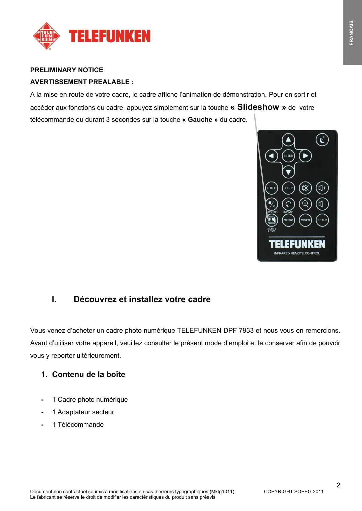 Vous venez d'acheter un cadre photo numérique TELEFUNKEN DPF 7933 et nous vous en remercions. Avant d'utiliser votre appareil, veuillez consulter le présent mode d'emploi et le conserver afin de pouvoir vous y reporter ultérieurement.