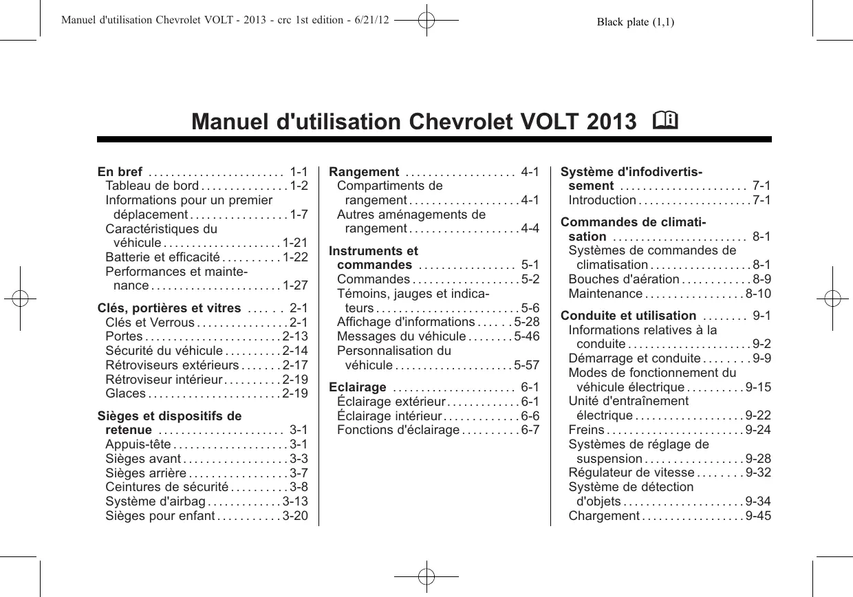 Manuel d'utilisation Chevrolet VOLT - 2013 - crc 1st edition - 6/21/12 Black plate (1,1) Manuel d'utilisation Chevrolet VOLT 2013 M En bref . . . . . . . . . . . . . . . . . . . . . . . . 1-1 Tableau de bord . . . . . . . . . . . . . . . 1-2 Informations pour un premier déplacement . . . . . . . . . . . . . . . . . 1-7 Caractéristiques du véhicule . . . . . . . . . . . . . . . . . . . . . 1-21 Batterie et efficacité . . . . . . . . . . 1-22 Performances et maintenance . . . . . . . . . . . . . . . . . . . . . . . 1-27 Clés, portières et vitres . . . . . . 2-1 Clés et Verrous . . . . . . . . . . . . . . . . 2-1 Portes . . . . . . . . . . . . . . . . . . . . . . . . 2-13 Sécurité du véhicule . . . . . . . . . . 2-14 Rétroviseurs extérieurs . . . . . . . 2-17 Rétroviseur intérieur . . . . . . . . . . 2-19 Glaces . . . . . . . . . . . . . . . . . . . . . . . 2-19 Sièges et dispositifs de retenue . . . . . . . . . . . . . . . . . . . . . . 3-1 Appuis-tête . . . . . . . . . . . . . . . . . . . . 3-1 Sièges avant . . . . . . . . . . . . . . . . . . 3-3 Sièges arrière . . . . . . . . . . . . . . . . . 3-7 Ceintures de sécurité . . . . . . . . . . 3-8 Système d'airbag . . . . . . . . . . . . . 3-13 Sièges pour enfant . . . . . . . . . . . 3-20 Rangement . . . . . . . . . . . . . . . . . . . 4-1 Compartiments de rangement . . . . . . . . . . . . . . . . . . . 4-1 Autres aménagements de rangement . . . . . . . . . . . . . . . . . . . 4-4 Instruments et commandes . . . . . . . . . . . . . . . . . 5-1 Commandes . . . . . . . . . . . . . . . . . . . 5-2 Témoins, jauges et indicateurs . . . . . . . . . . . . . . . . . . . . . . . . . 5-6 Affichage d'informations . . . . . . 5-28 Messages du véhicule . . . . . . . . 5-46 Personnalisation du véhicule . . . . . . . . . . . . . . . . . . . . . 5-57 Eclairage . . . . . . . . . . . . . . . . . . . . . . 6-1 Éclairage extérieur . . . . . . . . . . . . . 6-1 Éclairage intérieur . . . . . . . . . . . . . 6-6 Fonctions d'éclairage . . . . . . . . . . 6-7 Système d'infodivertissement . . . . . . . . . . . . . . . . . . . . . . 7-1 Introduction . . . . . . . . . . . . . . . . . . . . 7-1 Commandes de climatisation . . . . . . . . . . . . . . . . . . . . . . . . 8-1 Systèmes de commandes de climatisation . . . . . . . . . . . . . . . . . . 8-1 Bouches d'aération . . . . . . . . . . . . 8-9 Maintenance . . . . . . . . . . . . . . . . . 8-10 Conduite et utilisation . . . . . . . . 9-1 Informations relatives à la conduite . . . . . . . . . . . . . . . . . . . . . . 9-2 Démarrage et conduite . . . . . . . . 9-9 Modes de fonctionnement du véhicule électrique . . . . . . . . . . 9-15 Unité d'entraînement électrique . . . . . . . . . . . . . . . . . . . 9-22 Freins . . . . . . . . . . . . . . . . . . . . . . . . 9-24 Systèmes de réglage de suspension . . . . . . . . . . . . . . . . . 9-28 Régulateur de vitesse . . . . . . . . 9-32 Système de détection d'objets . . . . . . . . . . . . . . . . . . . . . 9-34 Chargement . . . . . . . . . . . . . . . . . . 9-45 Manuel d'utilisation Chevrolet VOLT - 2013 - crc 1st edition - 6/21/12 Black plate (2,1) Manuel d'utilisation Chevrolet VOLT 2013 M Carburant . . . . . . . . . . . . . . . . . . . . 9-54 Tractage d'une remorque . . . . . 9-56 Conversions et équipements complémentaires . . . . . . . . . . . . 9-56 Soin du véhicule . . . . . . . . . . . . 10-1 Informations générales . . . . . . . 10-2 Contrôles du véhicule . . . . . . . . 10-3 Réglage de phare . . . . . . . . . . . 10-23 Remplacement d'ampoule . . . 10-24 Circuit électrique . . . . . . . . . . . . 10-28 Roues et pneus . . . . . . . . . . . . . 10-40 Démarrage par câbles auxiliaires . . . . . . . . . . . . . . . . . . 10-58 Remorquage . . . . . . . . . . . . . . . . 10-64 Soins d'aspect . . . . . . . . . . . . . . 10-68 Service et maintenance . . . . . 11-1 Informations générales . . . . . . . 11-1 Entretien de routine . . . . . . . . . . . 11-2 Fluides, lubrifiants et pièces recommandés . . . . . . . . . . . . . . . 11-8 Caractéristiques techniques . . . . . . . . . . . . . . . . . 12-1 Identification du véhicule . . . . . 12-1 Données relatives au véhicule . . . . . . . . . . . . . . . . . . . . . 12-2 Informations client . . . . . . . . . . 13-1 Informations client . . . . . . . . . . . . 13-2 Enregistrement des données du véhicule et vie privée . . . . 13-9 Index . . . . . . . . . . . . . . . . . . . . . i-1 Manuel d'utilisation Chevrolet VOLT - 2013 - crc 1st edition - 6/21/12 Black plate (3,1) Introduction Données spécifiques au véhicule Veuillez inscrire les données relatives à votre véhicule sur la page précédente afin de garantir leur disponibilité. Ces informations sont disponibles dans les sections intitulées « Entretien et maintenance » et « Données techniques », ainsi que sur la plaque d'identification. Introduction Votre véhicule est un savant mélange de technologie avancée, de sécurité, de respect de l'environnement et d'économie. Ce manuel de l'utilisateur contient toutes les informations requises pour vous permettre de conduire votre véhicule en toute sécurité et de manière efficace. Assurez-vous que vos passagers sont conscients du risque potentiel d'accident et de blessures pouvant résulter d'un usage inadapté de ce véhicule. Il convient de toujours respecter la réglementation et la législation en vigueur dans le pays où vous vous trouvez. Ces lois peuvent donner des consignes différentes des informations contenues dans le présent manuel de l'utilisateur. Comment utiliser ce manuel