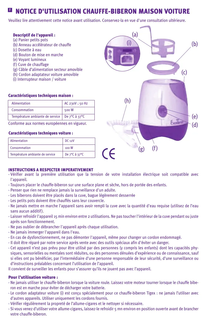 Veuillez lire attentivement cette notice avant utilisation. Conservez-la en vue d'une consultation ultérieure. Descriptif de l'appareil : (a) Panier petits pots (b) Anneau accélérateur de chauffe (c) Dosette à eau (d) Bouton de mise en marche (e) Voyant lumineux (f) Cuve de chauffage (g) Câble d’alimentation secteur amovible (h) Cordon adaptateur voiture amovible (i) Interrupteur maison / voiture (a) (i) (b) (c) Caractéristiques techniques maison : Alimentation AC 230V ; 50 Hz Consommation 500 W Température ambiante de service De 7°C à 37°C (h) (e) (d) Conforme aux normes européennes en vigueur. Caractéristiques techniques voiture : Alimentation DC 12V Consommation 100 W Température ambiante de service De 7°C à 37°C (g) (f)