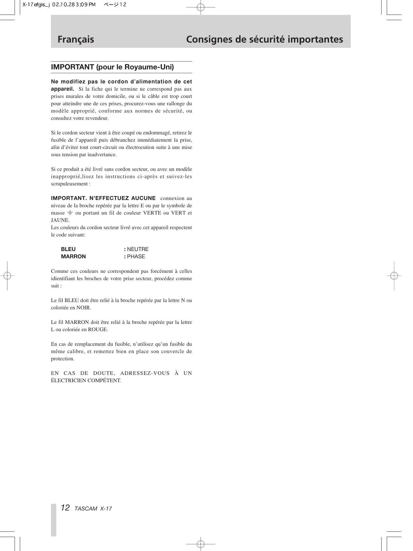 Ne modifiez pas le cordon d’alimentation de cet appareil. Si la fiche qui le termine ne correspond pas aux prises murales de votre domicile, ou si le câble est trop court pour atteindre une de ces prises, procurez-vous une rallonge du modèle approprié, conforme aux normes de sécurité, ou consultez votre revendeur. Si le cordon secteur vient à être coupé ou endommagé, retirez le fusible de l’appareil puis débranchez immédiatement la prise, afin d’éviter tout court-circuit ou électrocution suite à une mise sous tension par inadvertance. Si ce produit a été livré sans cordon secteur, ou avec un modèle inapproprié,lisez les instructions ci-après et suivez-les scrupuleusement : IMPORTANT. N’EFFECTUEZ AUCUNE connexion au niveau de la broche repérée par la lettre E ou par le symbole de masse ç ou portant un fil de couleur VERTE ou VERT et JAUNE. Les couleurs du cordon secteur livré avec cet appareil respectent le code suivant: BLEU MARRON