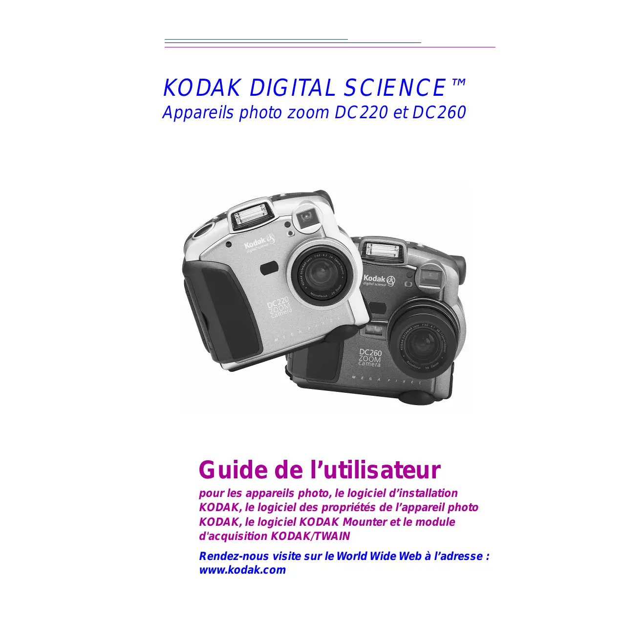 Guide de l’utilisateur pour les appareils photo, le logiciel d’installation KODAK, le logiciel des propriétés de l’appareil photo KODAK, le logiciel KODAK Mounter et le module d'acquisition KODAK/TWAIN Rendez-nous visite sur le World Wide Web à l’adresse : www.kodak.com