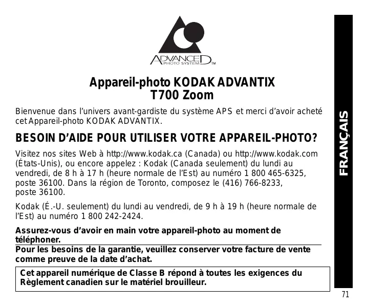 Kodak (É.-U. seulement) du lundi au vendredi, de 9 h à 19 h (heure normale de l’Est) au numéro 1 800 242-2424. Assurez-vous d’avoir en main votre appareil-photo au moment de téléphoner. Pour les besoins de la garantie, veuillez conserver votre facture de vente comme preuve de la date d’achat. Cet appareil numérique de Classe B répond à toutes les exigences du Règlement canadien sur le matériel brouilleur. 71