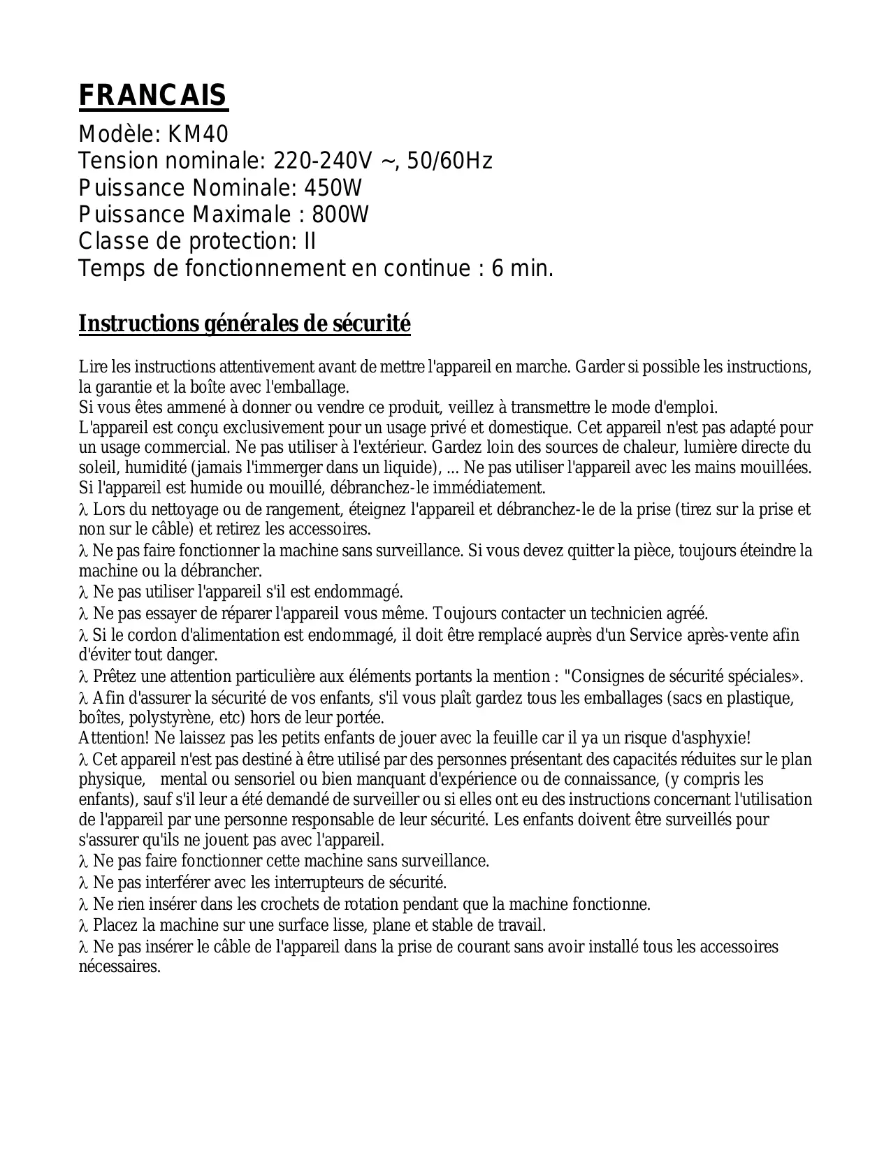 FRANCAIS Modèle: KM40 Tension nominale: 220-240V ~, 50/60Hz Puissance Nominale: 450W Puissance Maximale : 800W Classe de protection: II Temps de fonctionnement en continue : 6 min. Instructions générales de sécurité Lire les instructions attentivement avant de mettre l'appareil en marche. Garder si possible les instructions, la garantie et la boîte avec l'emballage. Si vous êtes ammené à donner ou vendre ce produit, veillez à transmettre le mode d'emploi. L'appareil est conçu exclusivement pour un usage privé et domestique. Cet appareil n'est pas adapté pour un usage commercial. Ne pas utiliser à l'extérieur. Gardez loin des sources de chaleur, lumière directe du soleil, humidité (jamais l'immerger dans un liquide), ... Ne pas utiliser l'appareil avec les mains mouillées. Si l'appareil est humide ou mouillé, débranchez-le immédiatement. Lors du nettoyage ou de rangement, éteignez l'appareil et débranchez-le de la prise (tirez sur la prise et non sur le câble) et retirez les accessoires. Ne pas faire fonctionner la machine sans surveillance. Si vous devez quitter la pièce, toujours éteindre la machine ou la débrancher. Ne pas utiliser l'appareil s'il est endommagé. Ne pas essayer de réparer l'appareil vous même. Toujours contacter un technicien agréé. Si le cordon d'alimentation est endommagé, il doit être remplacé auprès d'un Service après-vente afin d'éviter tout danger. Prêtez une attention particulière aux éléments portants la mention : "Consignes de sécurité spéciales». Afin d'assurer la sécurité de vos enfants, s'il vous plaît gardez tous les emballages (sacs en plastique, boîtes, polystyrène, etc) hors de leur portée. Attention! Ne laissez pas les petits enfants de jouer avec la feuille car il ya un risque d'asphyxie! Cet appareil n'est pas destiné à être utilisé par des personnes présentant des capacités réduites sur le plan physique, mental ou sensoriel ou bien manquant d'expérience ou de connaissance, (y compris les enfants), sauf s'il leur a été demandé de surveiller ou si elles ont eu des instructions concernant l'utilisation de l'appareil par une personne responsable de leur sécurité. Les enfants doivent être surveillés pour s'assurer qu'ils ne jouent pas avec l'appareil. Ne pas faire fonctionner cette machine sans surveillance. Ne pas interférer avec les interrupteurs de sécurité. Ne rien insérer dans les crochets de rotation pendant que la machine fonctionne. Placez la machine sur une surface lisse, plane et stable de travail. Ne pas insérer le câble de l'appareil dans la prise de courant sans avoir installé tous les accessoires nécessaires. Descriptif des composants