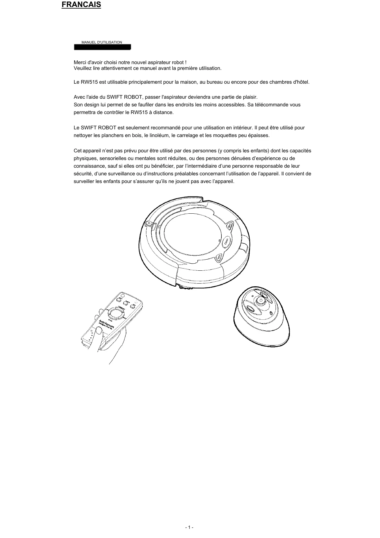 Merci d'avoir choisi notre nouvel aspirateur robot ! Veuillez lire attentivement ce manuel avant la première utilisation. Le RW515 est utilisable principalement pour la maison, au bureau ou encore pour des chambres d'hôtel. Avec l'aide du SWIFT ROBOT, passer l'aspirateur deviendra une partie de plaisir. Son design lui permet de se faufiler dans les endroits les moins accessibles. Sa télécommande vous permettra de contrôler le RW515 à distance. Le SWIFT ROBOT est seulement recommandé pour une utilisation en intérieur. Il peut être utilisé pour nettoyer les planchers en bois, le linoléum, le carrelage et les moquettes peu épaisses. Cet appareil n’est pas prévu pour être utilisé par des personnes (y compris les enfants) dont les capacités physiques, sensorielles ou mentales sont réduites, ou des personnes dénuées d’expérience ou de connaissance, sauf si elles ont pu bénéficier, par l’intermédiaire d’une personne responsable de leur sécurité, d’une surveillance ou d’instructions préalables concernant l’utilisation de l’appareil. Il convient de surveiller les enfants pour s’assurer qu’ils ne jouent pas avec l’appareil.