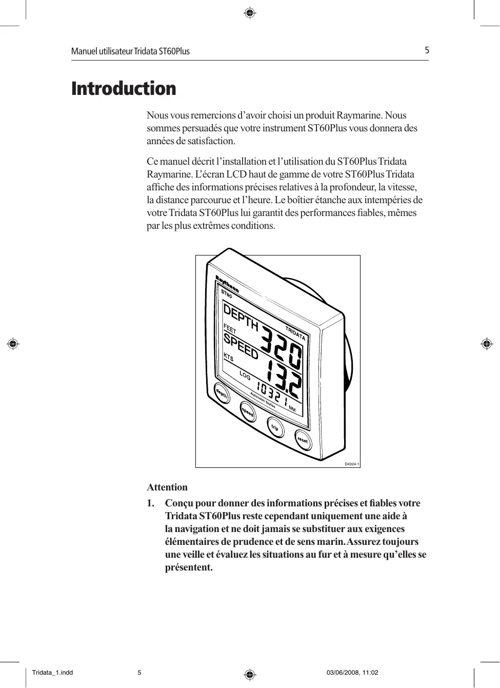 Manuel utilisateur Tridata ST60Plus Introduction Nous vous remercions d’avoir choisi un produit Raymarine. Nous sommes persuadés que votre instrument ST60Plus vous donnera des années de satisfaction. Ce manuel décrit l’installation et l’utilisation du ST60Plus Tridata Raymarine. L’écran LCD haut de gamme de votre ST60Plus Tridata affiche des informations précises relatives à la profondeur, la vitesse, la distance parcourue et l’heure. Le boîtier étanche aux intempéries de votre Tridata ST60Plus lui garantit des performances fiables, mêmes par les plus extrêmes conditions. D4324-1 Attention