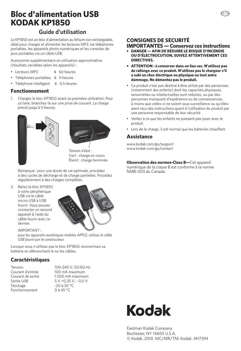www.kodak.com/go/support www.kodak.com/go/contact Observation des normes-Class B—Cet appareil numérique de la classe B est conforme à la norme NMB-003 du Canada. Reliez le bloc KP1850 à votre périphérique USB via le câble micro-USB à USB fourni. Vous pouvez connecter un second appareil à l'aide du câble fourni avec ce dernier. IMPORTANT : pour les appareils numériques mobiles APPLE, utilisez le câble USB fourni par le constructeur. Lorsque vous n'utilisez pas le bloc KP1850, économisez sa batterie en débranchant le ou les câbles. Caractéristiques Tension Courant d'entrée Courant de sortie Sortie USB Stockage Fonctionnement 100-240 V, 50/60 Hz 100 mA maximum 1 000 mA maximum 5 V +0,35 V ; -0,0 V -20 à 30 °C 0 à 45 °C Eastman Kodak Company Rochester, NY 14650 U.S.A. © Kodak, 2010. MC/MR/TM: Kodak. 4H7394
