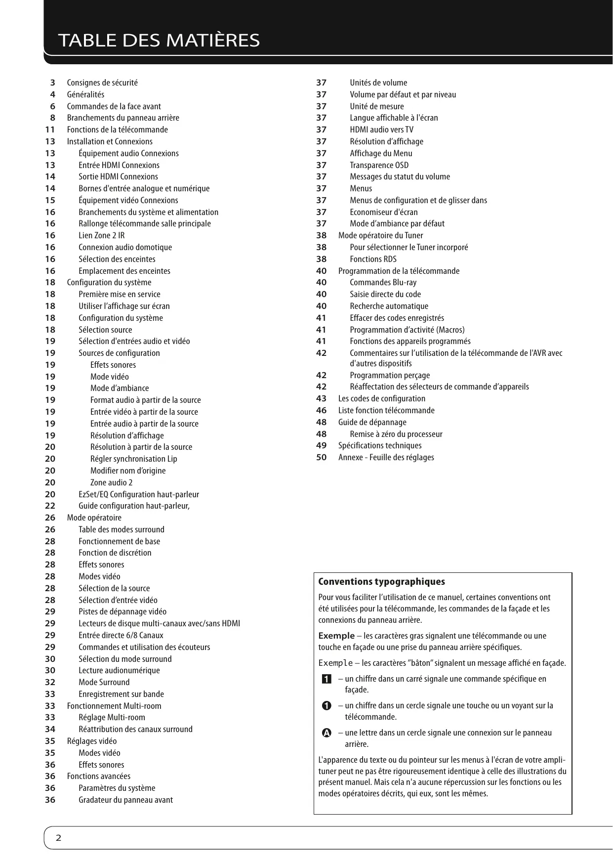 Guide D’utilisation Table des matières 3 Consignes de sécurité 4 Généralités 6 Commandes de la face avant 8 Branchements du panneau arrière 11 Fonctions de la télécommande 13 Installation et Connexions 13 Équipement audio Connexions 13 Entrée HDMI Connexions 14 Sortie HDMI Connexions 14 Bornes d'entrée analogue et numérique 15 Équipement vidéo Connexions 16 Branchements du système et alimentation 16 Rallonge télécommande salle principale 16 Lien Zone 2 IR 16 Connexion audio domotique 16 Sélection des enceintes 16 Emplacement des enceintes 18 Configuration du système 18 Première mise en service 18 Utiliser l’affichage sur écran 18 Configuration du système 18 Sélection source 19 Sélection d'entrées audio et vidéo 19 Sources de configuration 19 Effets sonores 19 Mode vidéo 19 Mode d’ambiance 19 Format audio à partir de la source 19 Entrée vidéo à partir de la source 19 Entrée audio à partir de la source 19 Résolution d’affichage 20 Résolution à partir de la source 20 Régler synchronisation Lip 20 Modifier nom d’origine 20 Zone audio 2 20 EzSet/EQ Configuration haut-parleur 22 Guide configuration haut-parleur, 26 Mode opératoire 26 Table des modes surround 28 Fonctionnement de base 28 Fonction de discrétion 28 Effets sonores 28 Modes vidéo 28 Sélection de la source 28 Sélection d’entrée vidéo 29 Pistes de dépannage vidéo 29 Lecteurs de disque multi-canaux avec/sans HDMI 29 Entrée directe 6/8 Canaux 29 Commandes et utilisation des écouteurs 30 Sélection du mode surround 30 Lecture audionumérique 32 Mode Surround 33 Enregistrement sur bande 33 Fonctionnement Multi-room 33 Réglage Multi-room 34 Réattribution des canaux surround 35 Réglages vidéo 35 Modes vidéo 36 Effets sonores 36 Fonctions avancées 36 Paramètres du système 36 Gradateur du panneau avant
