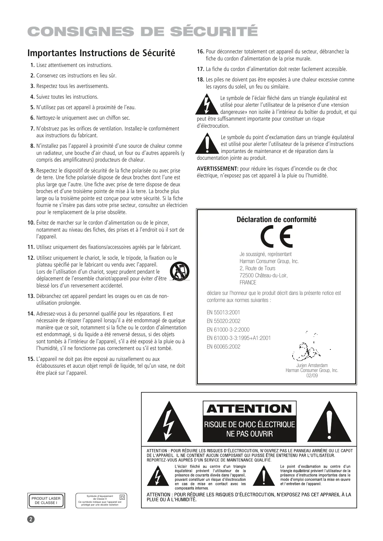 Je soussigné, représentant Harman Consumer Group, Inc. 2, Route de Tours 72500 Château-du-Loir, FRANCE déclare sur l’honneur que le produit décrit dans la présente notice est conforme aux normes suivantes : EN 55013:2001 EN 55020:2002 EN 61000-3-2:2000 EN 61000-3-3:1995+A1:2001 EN 60065:2002 Jurjen Amsterdam Harman Consumer Group, Inc. 02/09