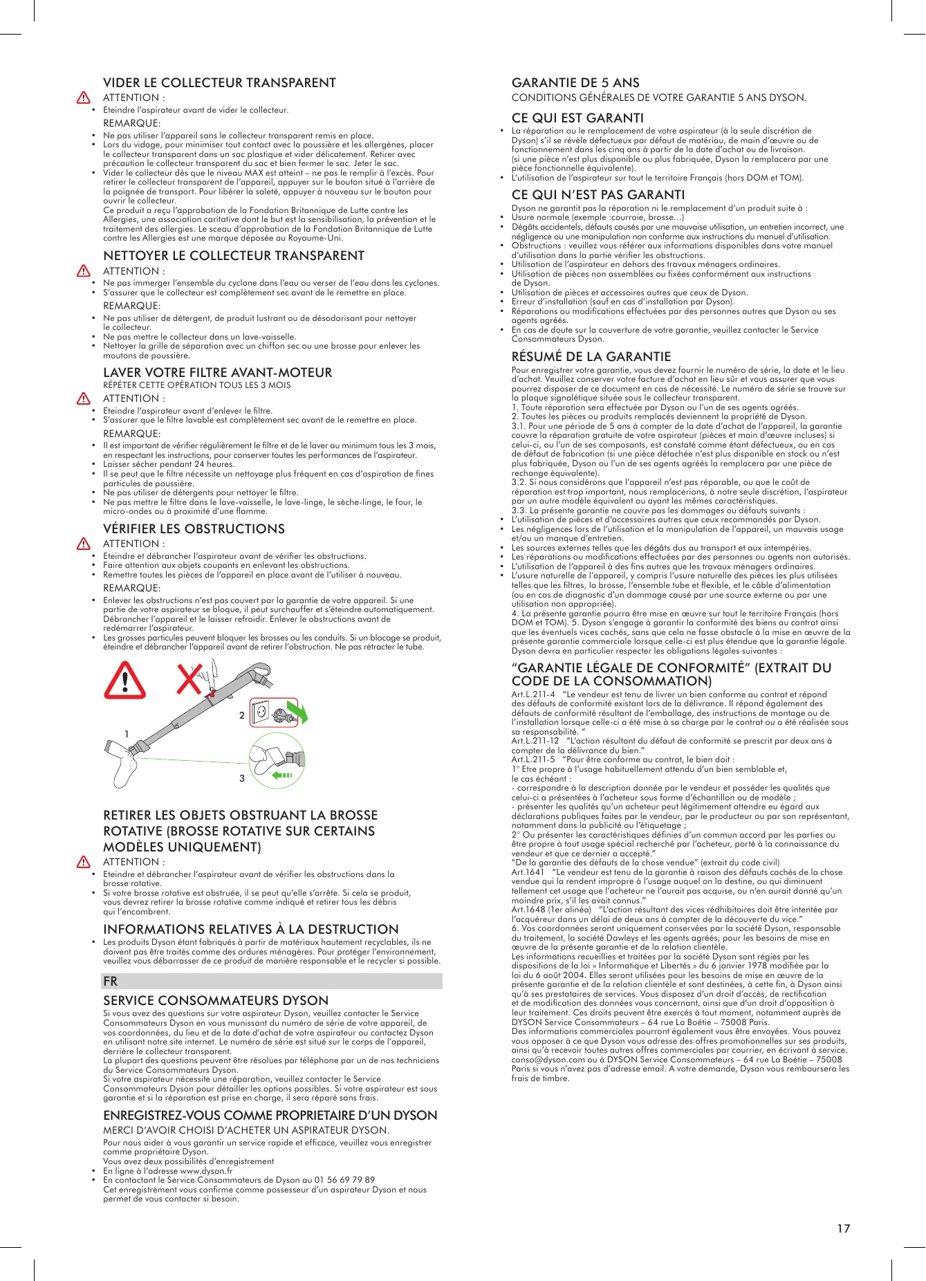 Si vous avez des questions sur votre aspirateur Dyson, veuillez contacter le Service Consommateurs Dyson en vous munissant du numéro de série de votre appareil, de vos coordonnées, du lieu et de la date d’achat de votre aspirateur ou contactez Dyson en utilisant notre site internet. Le numéro de série est situé sur le corps de l’appareil, derrière le collecteur transparent. La plupart des questions peuvent être résolues par téléphone par un de nos techniciens du Service Consommateurs Dyson. Si votre aspirateur nécessite une réparation, veuillez contacter le Service Consommateurs Dyson pour détailler les options possibles. Si votre aspirateur est sous garantie et si la réparation est prise en charge, il sera réparé sans frais. Art.L.211-4 “Le vendeur est tenu de livrer un bien conforme au contrat et répond des défauts de conformité existant lors de la délivrance. Il répond également des défauts de conformité résultant de l’emballage, des instructions de montage ou de l’installation lorsque celle-ci a été mise à sa charge par le contrat ou a été réalisée sous sa responsabilité. “ Art.L.211-12 “L’action résultant du défaut de conformité se prescrit par deux ans à compter de la délivrance du bien.” Art.L.211-5 “Pour être conforme au contrat, le bien doit : 1° Etre propre à l’usage habituellement attendu d’un bien semblable et, le cas échéant : - correspondre à la description donnée par le vendeur et posséder les qualités que celui-ci a présentées à l’acheteur sous forme d’échantillon ou de modèle ; - présenter les qualités qu’un acheteur peut légitimement attendre eu égard aux déclarations publiques faites par le vendeur, par le producteur ou par son représentant, notamment dans la publicité ou l’étiquetage ; 2° Ou présenter les caractéristiques définies d’un commun accord par les parties ou être propre à tout usage spécial recherché par l’acheteur, porté à la connaissance du vendeur et que ce dernier a accepté.” “De la garantie des défauts de la chose vendue” (extrait du code civil) Art.1641 “Le vendeur est tenu de la garantie à raison des défauts cachés de la chose vendue qui la rendent impropre à l’usage auquel on la destine, ou qui diminuent tellement cet usage que l’acheteur ne l’aurait pas acquise, ou n’en aurait donné qu’un moindre prix, s’il les avait connus.” Art.1648 (1er alinéa) “L’action résultant des vices rédhibitoires doit être intentée par l’acquéreur dans un délai de deux ans à compter de la découverte du vice.”