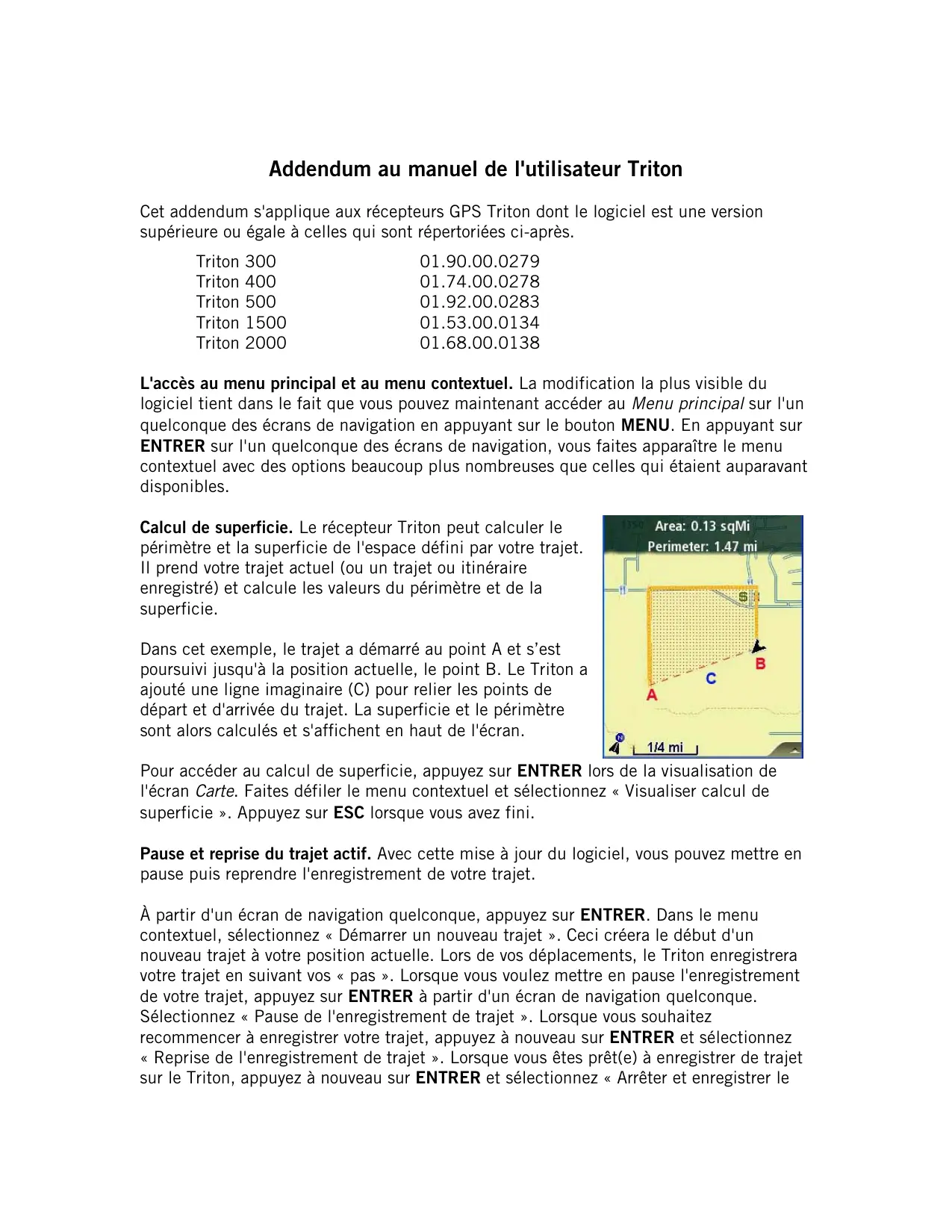 L'accès au menu principal et au menu contextuel. La modification la plus visible du logiciel tient dans le fait que vous pouvez maintenant accéder au Menu principal sur l'un quelconque des écrans de navigation en appuyant sur le bouton MENU. En appuyant sur ENTRER sur l'un quelconque des écrans de navigation, vous faites apparaître le menu contextuel avec des options beaucoup plus nombreuses que celles qui étaient auparavant disponibles. Calcul de superficie. Le récepteur Triton peut calculer le périmètre et la superficie de l'espace défini par votre trajet. Il prend votre trajet actuel (ou un trajet ou itinéraire enregistré) et calcule les valeurs du périmètre et de la superficie. Dans cet exemple, le trajet a démarré au point A et s’est poursuivi jusqu'à la position actuelle, le point B. Le Triton a ajouté une ligne imaginaire (C) pour relier les points de départ et d'arrivée du trajet. La superficie et le périmètre sont alors calculés et s'affichent en haut de l'écran. Pour accéder au calcul de superficie, appuyez sur ENTRER lors de la visualisation de l'écran Carte. Faites défiler le menu contextuel et sélectionnez « Visualiser calcul de superficie ». Appuyez sur ESC lorsque vous avez fini. Pause et reprise du trajet actif. Avec cette mise à jour du logiciel, vous pouvez mettre en pause puis reprendre l'enregistrement de votre trajet. À partir d'un écran de navigation quelconque, appuyez sur ENTRER. Dans le menu contextuel, sélectionnez « Démarrer un nouveau trajet ». Ceci créera le début d'un nouveau trajet à votre position actuelle. Lors de vos déplacements, le Triton enregistrera votre trajet en suivant vos « pas ». Lorsque vous voulez mettre en pause l'enregistrement de votre trajet, appuyez sur ENTRER à partir d'un écran de navigation quelconque. Sélectionnez « Pause de l'enregistrement de trajet ». Lorsque vous souhaitez recommencer à enregistrer votre trajet, appuyez à nouveau sur ENTRER et sélectionnez « Reprise de l'enregistrement de trajet ». Lorsque vous êtes prêt(e) à enregistrer de trajet sur le Triton, appuyez à nouveau sur ENTRER et sélectionnez « Arrêter et enregistrer le trajet ». L'écran d'informations de trajet s'affiche avec l'option de donner un nom au trajet enregistré (« Chemin »). Grille d'utilisateur. (Utilisateurs avancés) Vous pouvez définir une grille d'utilisateur comme système de coordonnées pour votre Triton. Lorsque vous sélectionnez Grille d'utilisateur, vous verrez s’afficher des options pour définir les paramètres de la grille d'utilisateur. Pour définir une grille d'utilisateur, appuyez sur MENU à partir d'un écran de navigation quelconque. Sélectionnez Vue > Réglages > Navigation. Dans le menu déroulant SYSTÈME DE COORDONNÉES, sélectionnez Grille d'utilisateur. Fournissez les informations requises pour les paramètres de la grille d'utilisateur. L'écran Navigation s'affiche avec la grille d'utilisateur comme système de coordonnées. Donnée de carte définie par utilisateur. (Utilisateurs avancés) Vous pouvez définir une donnée de carte définie par l'utilisateur pour votre Triton. Lorsque vous sélectionnez une donnée de carte, vous verrez s'afficher des options pour définir ses paramètres. Pour définir une donnée de carte, appuyez sur MENU à partir d'un écran de navigation quelconque. Sélectionnez Vue > Réglages > Navigation. Dans le menu déroulant DONNÉE DE CARTE, sélectionnez Utilisateur. Fournissez les paramètres pour la donnée. Lorsque vous avez terminé, l'écran Navigation s'affiche avec l'ensemble Utilisateur comme donnée de carte. Définir une position personnalisée. La définition de position personnalisée fournit un moyen de visualiser des zones de la carte autre que votre position actuelle. Lorsque que vous définissez une position personnalisée, la portion GPS du récepteur est désactivée et l'écran est réglé sur la position que vous sélectionnez, soit en saisissant ses coordonnées soit en faisant défiler la carte. Pour visualiser une position personnalisée, faites défiler les écrans de navigation jusqu'à l'écran Statut satellite. Appuyez sur ENTRER. Sélectionnez « Définir une position personnalisée » dans le menu contextuel. Saisissez les coordonnées ou sélectionnez la position à partir d'un point sur la carte. Une fois le point défini, sélectionnez « Activer la position personnalisée ». Pour désactiver la fonctionnalité et reprendre le calcul des informations de position GPS, allez à l'écran Statut satellite, appuyez sur ENTRER et sélectionnez « Désactiver la position personnalisée ». Sélection du point géographique de destination suivant dans un itinéraire à plusieurs segments. Lorsque vous avez un itinéraire actif qui contient plusieurs segments, vous pouvez maintenant sélectionner le prochain point de l’itinéraire vers lequel vous souhaitez naviguer. Vous pouvez choisir de vous rendre au point géographique suivant de l'itinéraire ou vers un point géographique précédent. Par exemple, vous activez un itinéraire qui comporte quatre segments, A à B à C à D à E. Lorsque l'itinéraire est activé, il commence automatiquement à vous acheminer vers la destination du premier segment (B). Mais dans cet exemple, vous êtes déjà proche du point géographique D et vous souhaitez aller là au lieu de prendre l'itinéraire tout entier. Vous pouvez dire au Triton d'aller à la destination suivante (C) et répéter le processus pour aller à la prochaine destination (D). En outre, si vous changez d'avis, vous pouvez lui indiquer d'aller à une destination précédente, dans notre cas (C). Pendant qu’un itinéraire multiple est actif, appuyez sur ENTRER pour faire afficher le menu contextuel. Sélectionnez « Aller à suivant » ou « Aller à précédent » pour choisir les destinations de votre itinéraire actif. Apéndice del Manual del Usuario de Triton Este apéndice sirve para