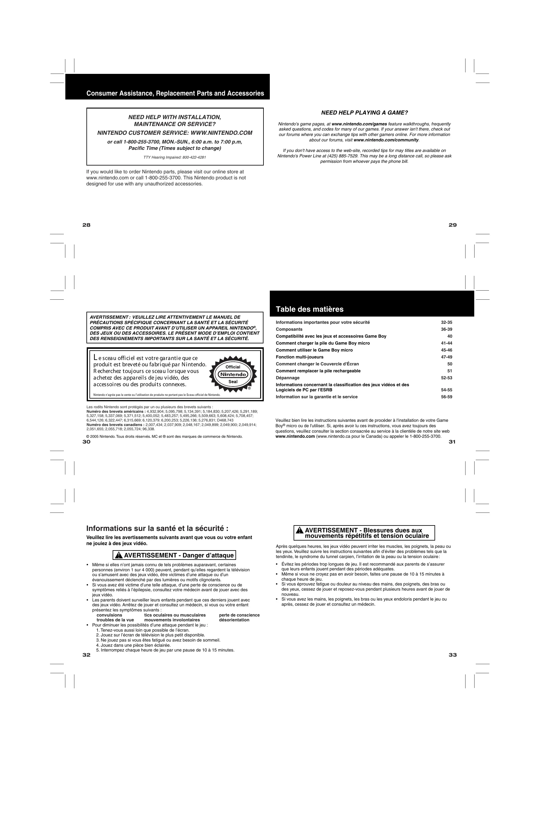 Veuillez bien lièr les instructions suivantes avant de procedé à l'installation de votre Game Boy® micro ou de l'utiliser. Si, après avoir lu ces instructions, vous avez toujours des questions, veuillez consulter la section consacrée au service à la clientèle de notre site web www.nintendo.com (www.nintendo.ca pour le Canada) ou appeler le 1-800-255-3700.
