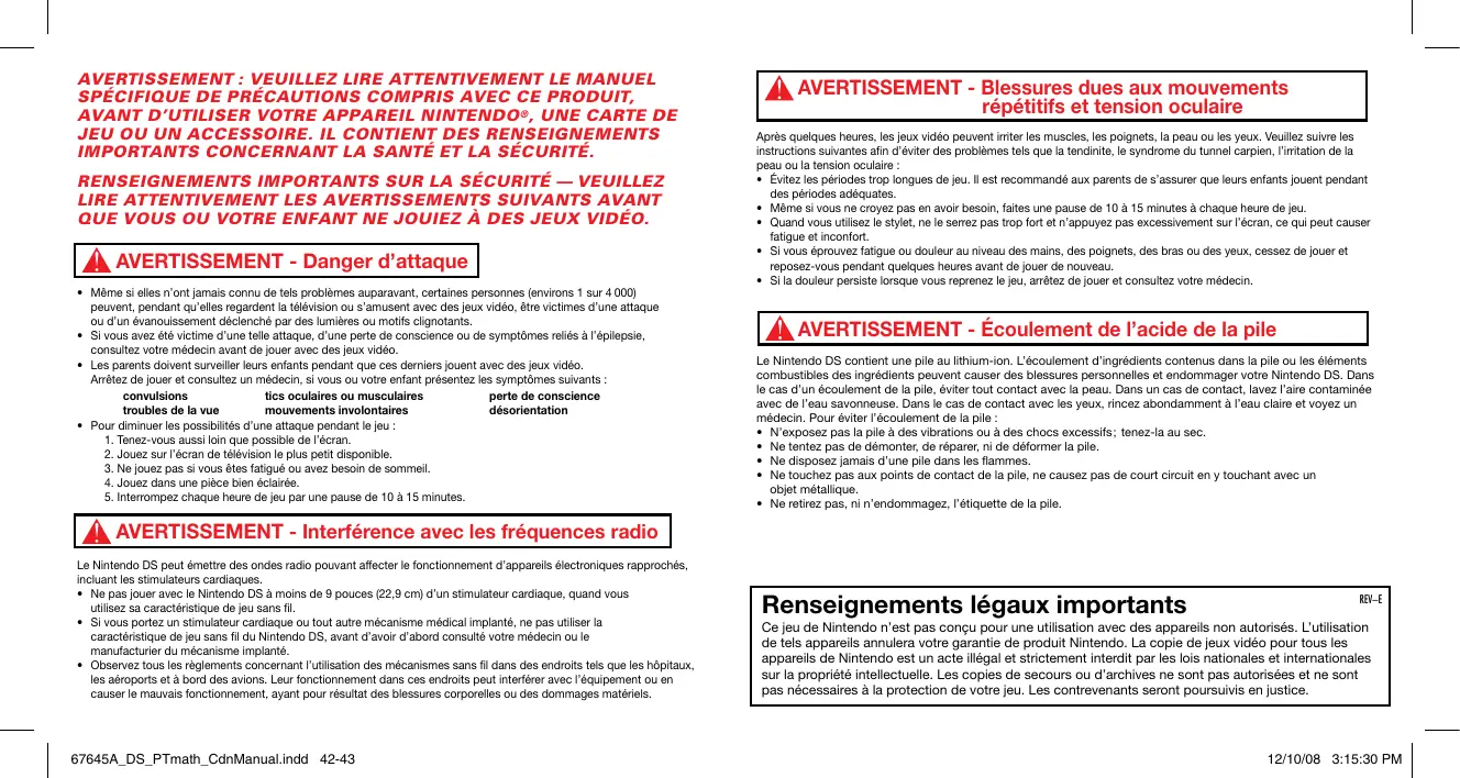- Observez tous les règlements concernant l’utilisation des mécanismes sans fil dans des endroits tels que les hôpitaux, les aéroports et à bord des avions. Leur fonctionnement dans ces endroits peut interférer avec l’équipement ou en causer le mauvais fonctionnement, ayant pour résultat des blessures corporelles ou des dommages matériels. 67645A_DS_PTmath_CdnManual.indd 42-43 Renseignements légaux importants REV–E Ce jeu de Nintendo n’est pas conçu pour une utilisation avec des appareils non autorisés. L’utilisation de tels appareils annulera votre garantie de produit Nintendo. La copie de jeux vidéo pour tous les appareils de Nintendo est un acte illégal et strictement interdit par les lois nationales et internationales sur la propriété intellectuelle. Les copies de secours ou d’archives ne sont pas autorisées et ne sont pas nécessaires à la protection de votre jeu. Les contrevenants seront poursuivis en justice. 12/10/08 3:15:30 PM Ce sceau officiel est votre garantie que le présent produit est agréé ou manufacturé par Nintendo. Cherchez-le toujours sur les boîtes des consoles de jeux vidéo, des accessoires, des jeux et d’autres produits apparentés.