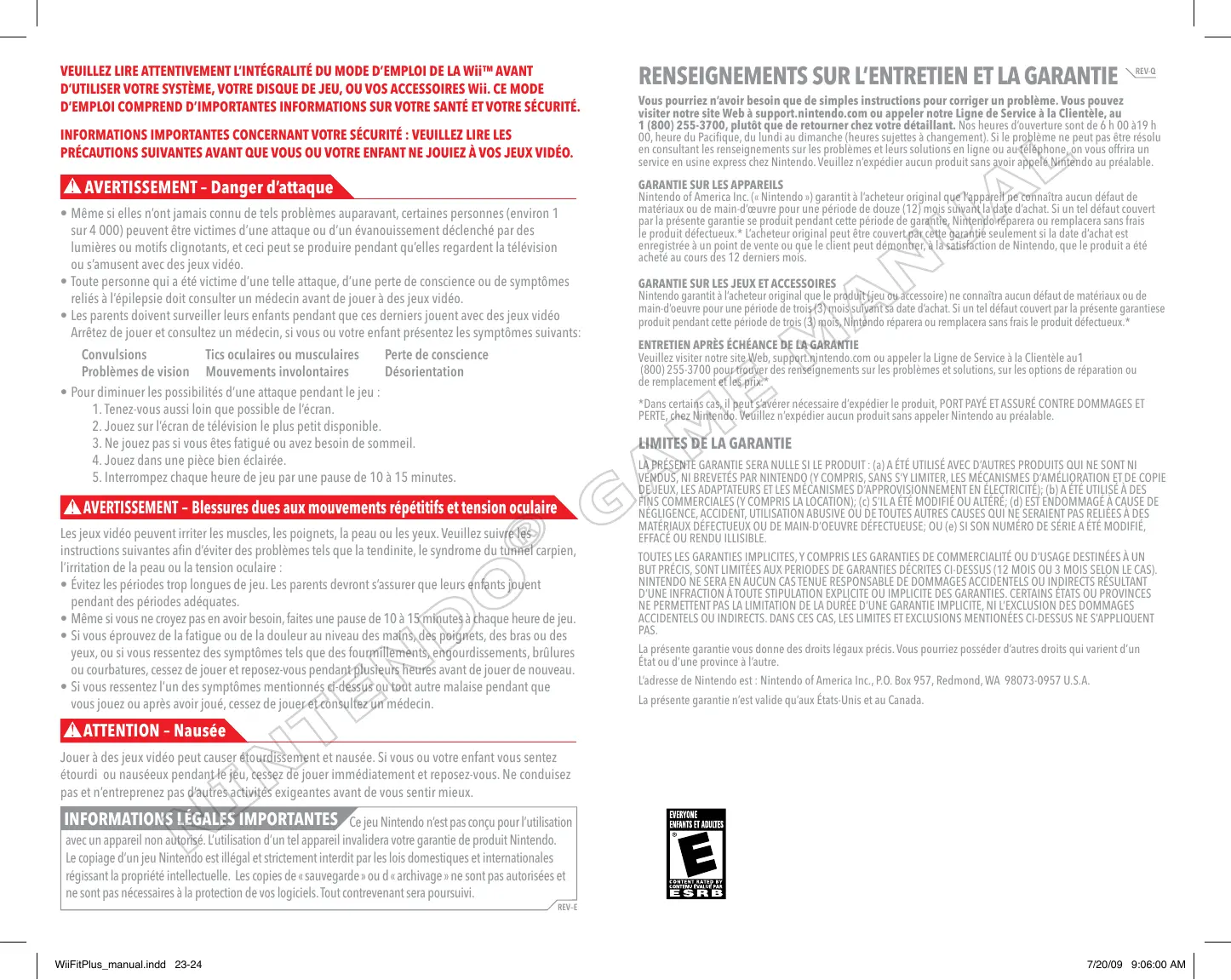 7/20/09 9:06:00 AM VEUILLEZ LIRE ATTENTIVEMENT L’INTÉGRALITÉ DU MODE D’EMPLOI DE LA Wii™ AVANT D’UTILISER VOTRE SYSTÈME, VOTRE DISQUE DE JEU, OU VOS ACCESSOIRES Wii. CE MODE D’EMPLOI COMPREND D’IMPORTANTES INFORMATIONS SUR VOTRE SANTÉ ET VOTRE SÉCURITÉ. INFORMATIONS IMPORTANTES CONCERNANT VOTRE SÉCURITÉ : VEUILLEZ LIRE LES PRÉCAUTIONS SUIVANTES AVANT QUE VOUS OU VOTRE ENFANT NE JOUIEZ À VOS JEUX VIDÉO. AVERTISSEMENT – Danger d’attaque